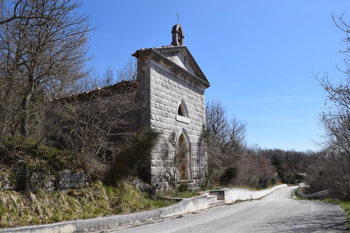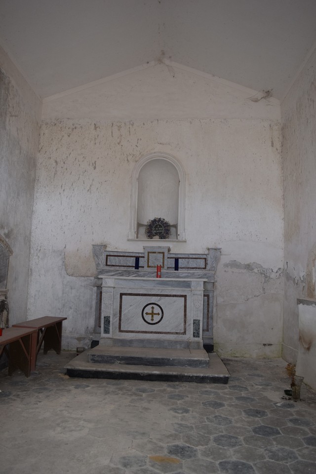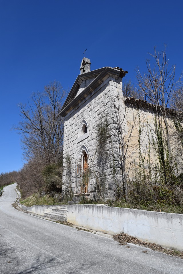 La cappella ha un orientamento Nord- Sud, impianto longitudinale ad aula e tetto a capanna e facciata ad attico triangolare. Il prospetto principale rivestito con pietra squadrata e grossolanamente bocciardata, presenta un portale ad arco a sesto acuto in pietra modanata, in asse con un sopraluce nello stesso stile e finitura; si conclude alla sommità con timpano triangolare aggettante e leggermente sporgente ai lati che cela le falde del tetto. Alla sommità è collocato un campanile a vela costituito da un arco ogivale, sormontato da una croce in ferro. A protezione dell’ingresso un cancello in ferro battuto. La muratura lateralmente è intonacata. All'interno un'altare in marmo addossato al setto absidale, su cui è aperta una nicchia per statua, e delle sepolture sulle pareti laterali