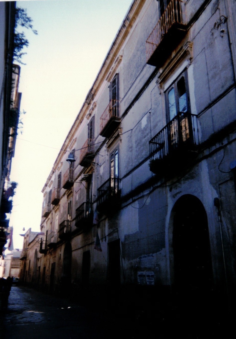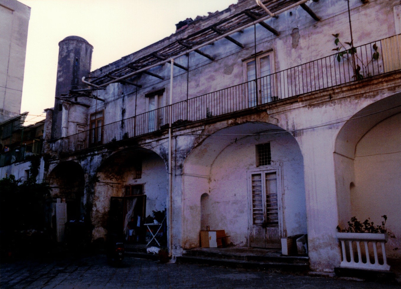 L'edificio, molto lungo, si presenta lineare, con ballatoi su arco collegati da una scala esterna, che divide il giardino-orto dal cortile. Quest'ultimo è chiuso da un edificio che presenta nell'angolo a sinistra un torrino circolare in muratura; una scala a chiocciola conduce al tetto. Il ballatoio di questo edificio si raccorda alla scala del corpo principale mediante un terrazzo posto su un grosso arcone, rinforzato da un pilastro centrale. Nell'angolo interno del cortile opposto alla scala vi è il pozzo e il lavatoio. All'edificio si accede da tre portoni: due conducono al giardino e un terzo al cortile, tutti coperti da volte. La struttura è in muratura di tufo con solai in legno e copertura a tetto, tranne che per la scala. L'androne su cortile e il retrocorpo, invece, presentano una copertura piana