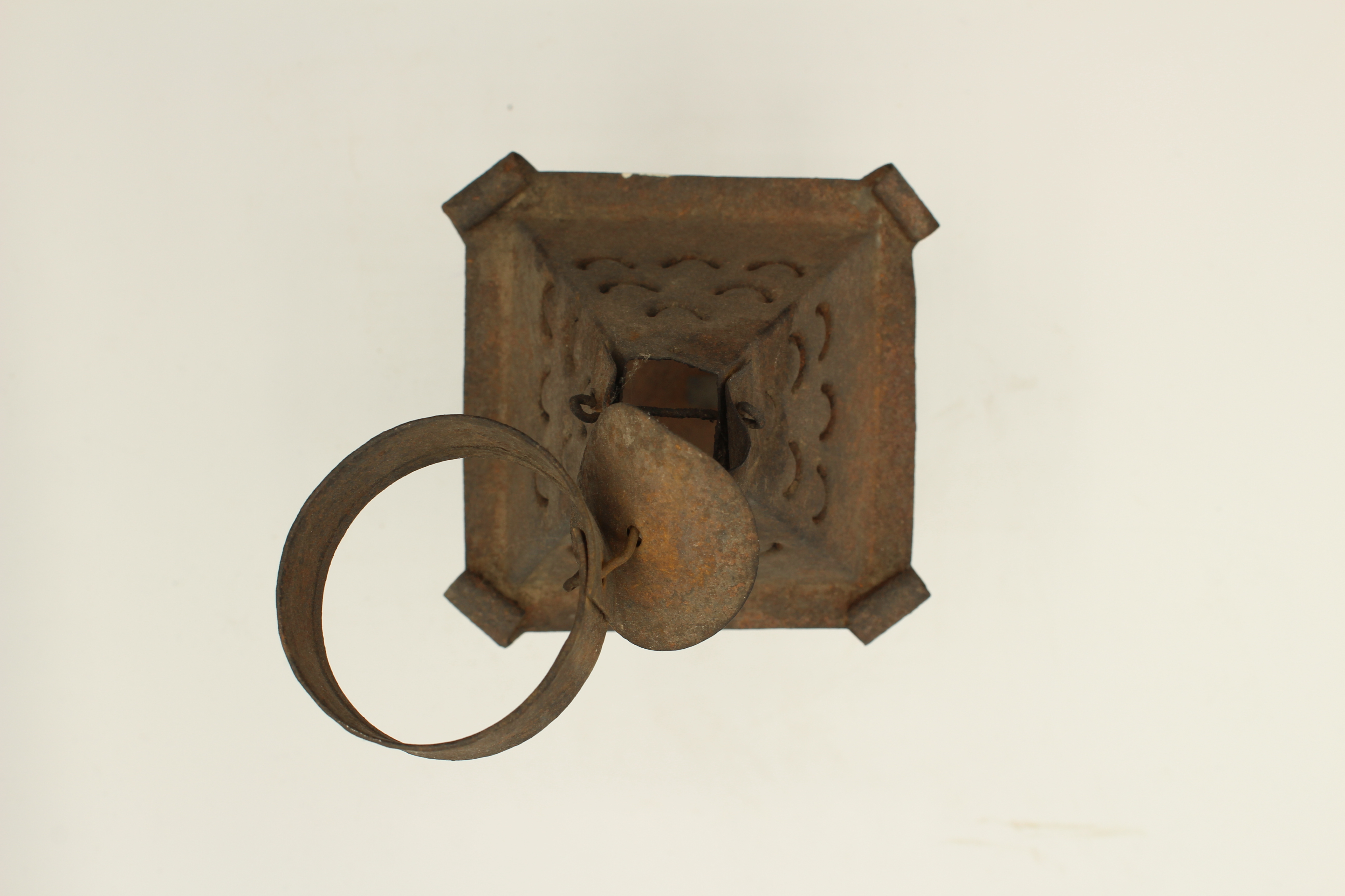 Lanterna a base quadrata con quattro pareti in vetro, una delle quali apribile, rette da un telaio e sormontate da una struttura piramidale incisa a piccole fessure e aperta alla sommità, a cui sono collegati due anelli costituiti da lamine piatte e larghe