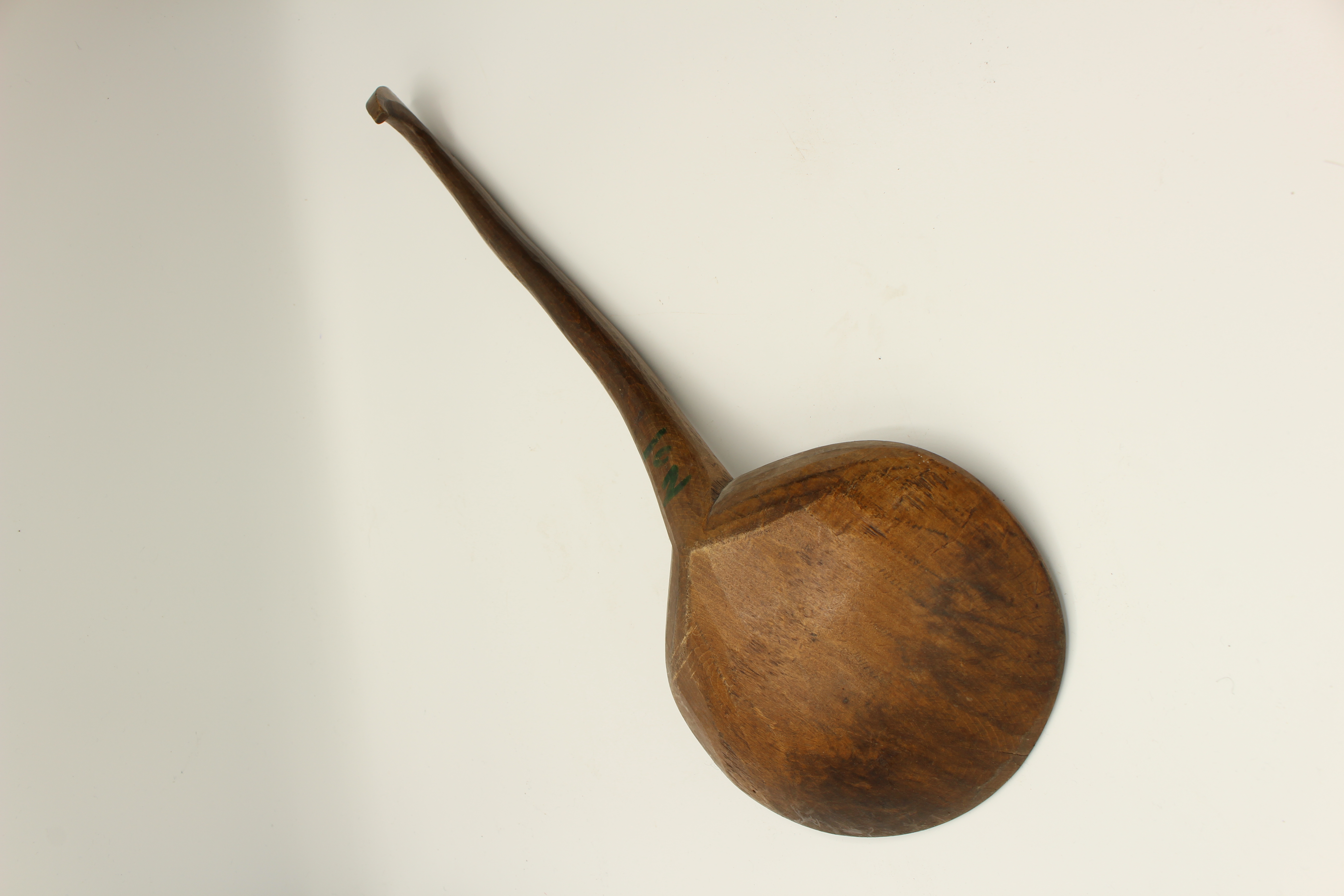 Cucchiaio largo e poco profondo. Nella parte posteriore del cucchiaio, dov'è fissato il manico, piuttosto lungo, il bordo è leggermente rialzato rispetto alla parte anteriore