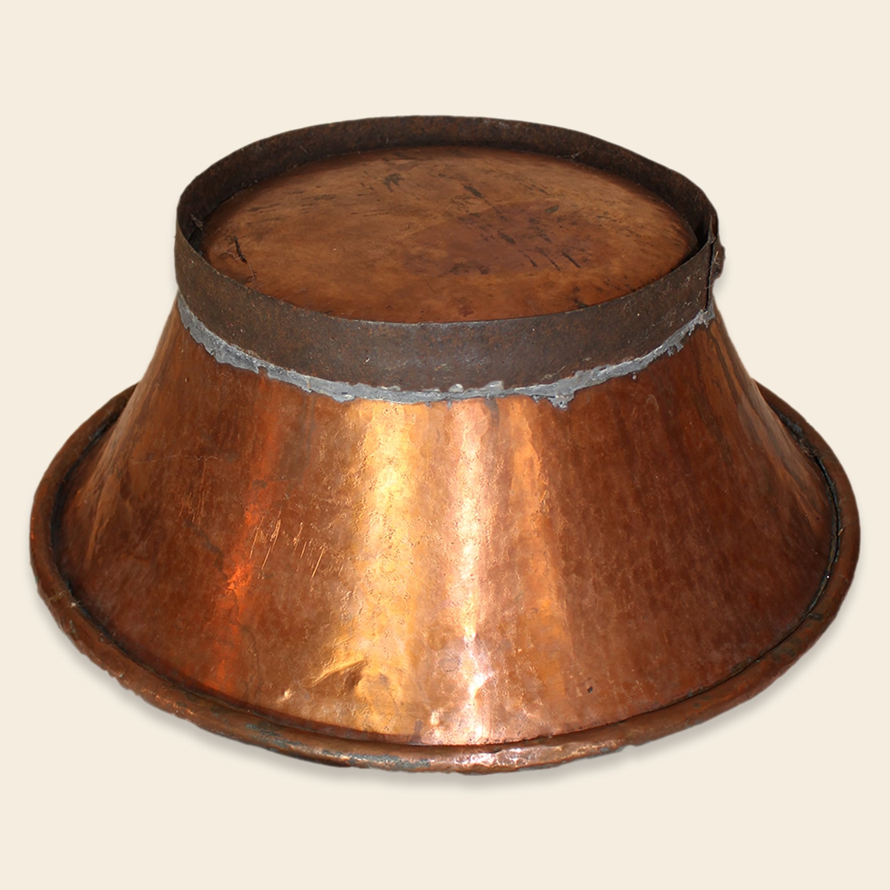 Recipiente tronco conico con base minore in basso, in rame e stagnato all'interno. Il fondo è piatto, la parte inferiore è stretta da un cerchio in ferro, il bordo superiore svasato