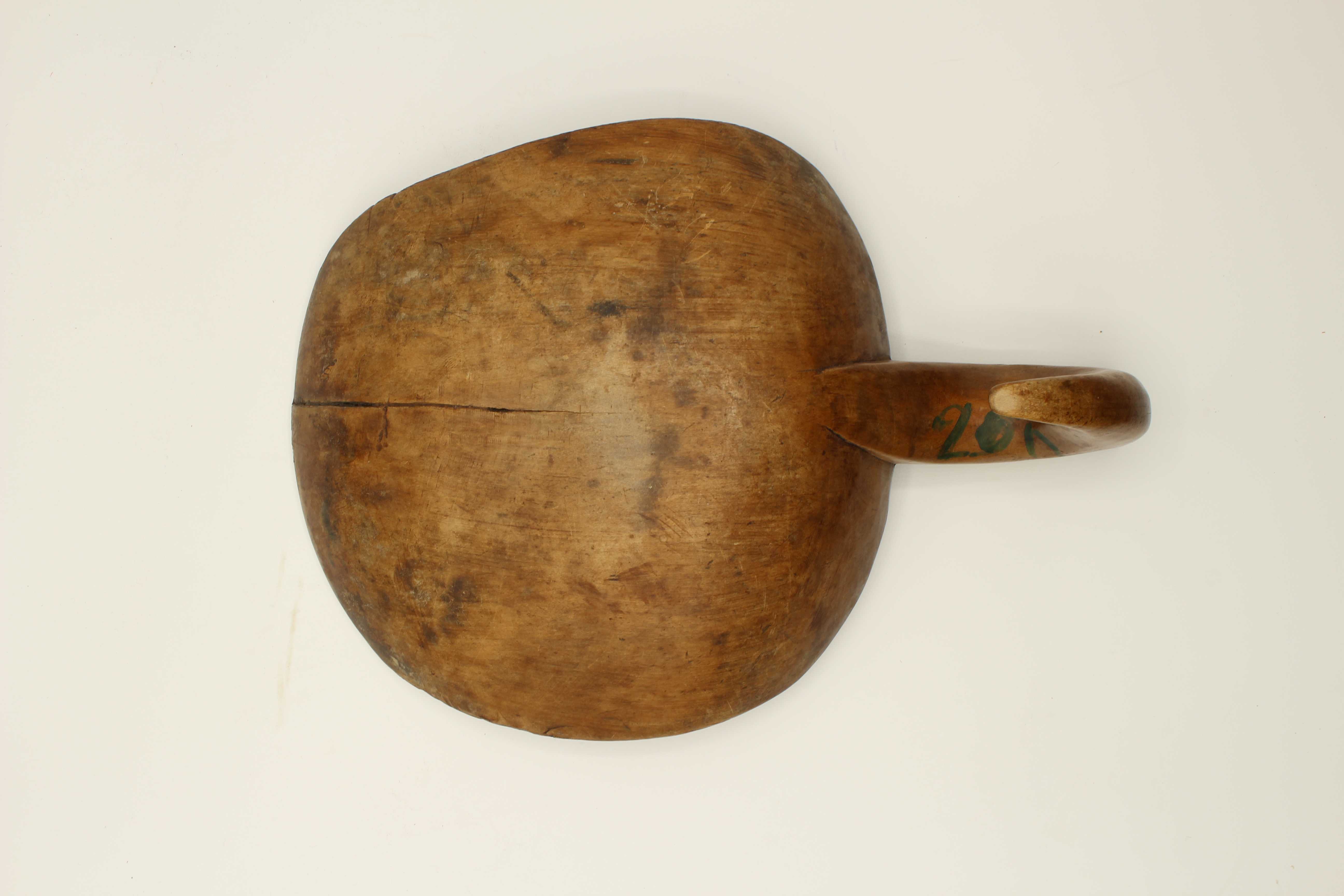 Ampio cucchiaio di forma quasi circolare, ma leggermente schiacciato, con corto manico ricurvo