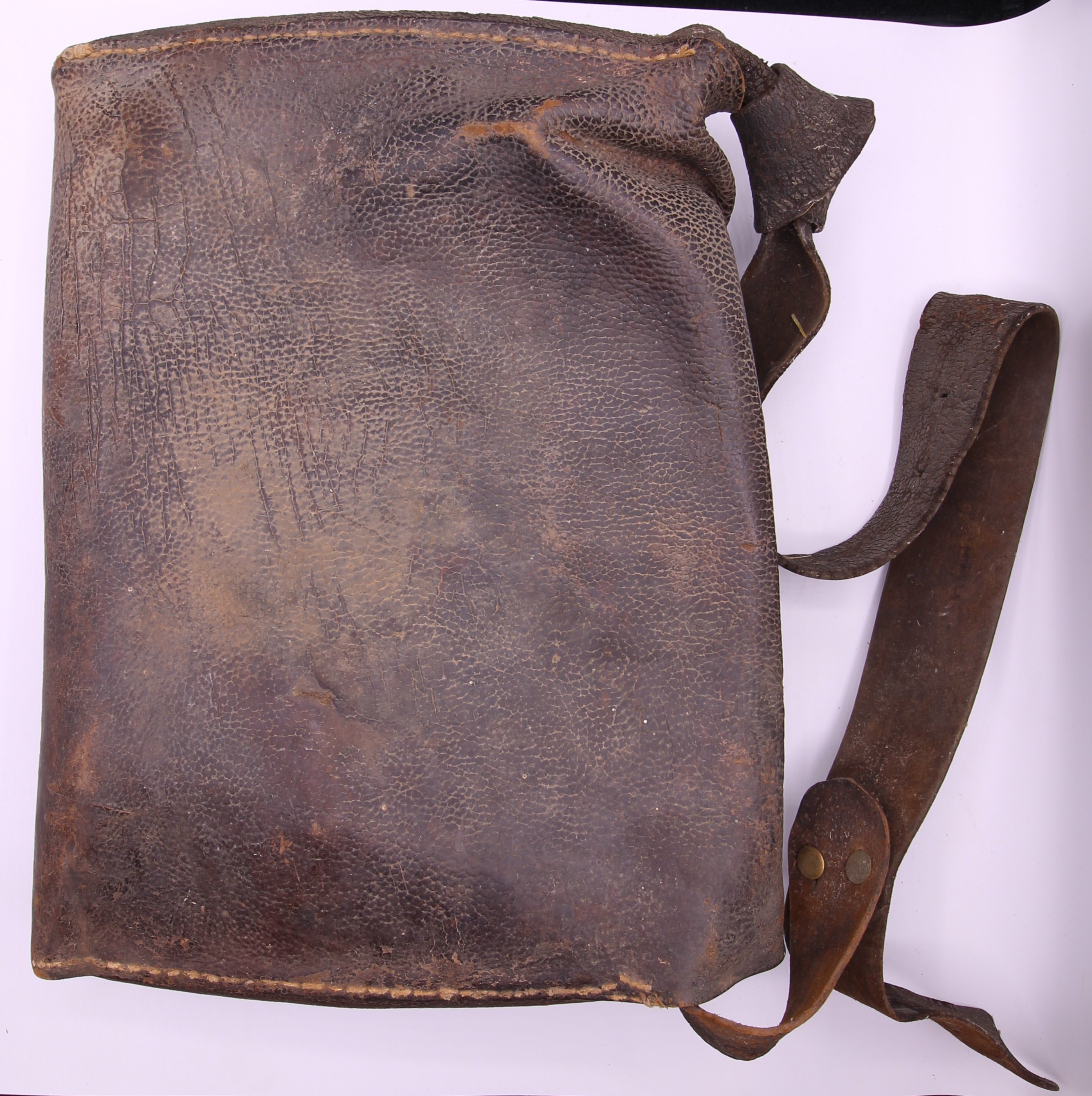 Tascapane costituito da una busta in cuoio con chiusura a fibia metallica e tracolla. La pelle utilizzata solitamente per fabbricare sacche e cinghie era quella di capra che presentava caratteristiche di elasticità e resistenza