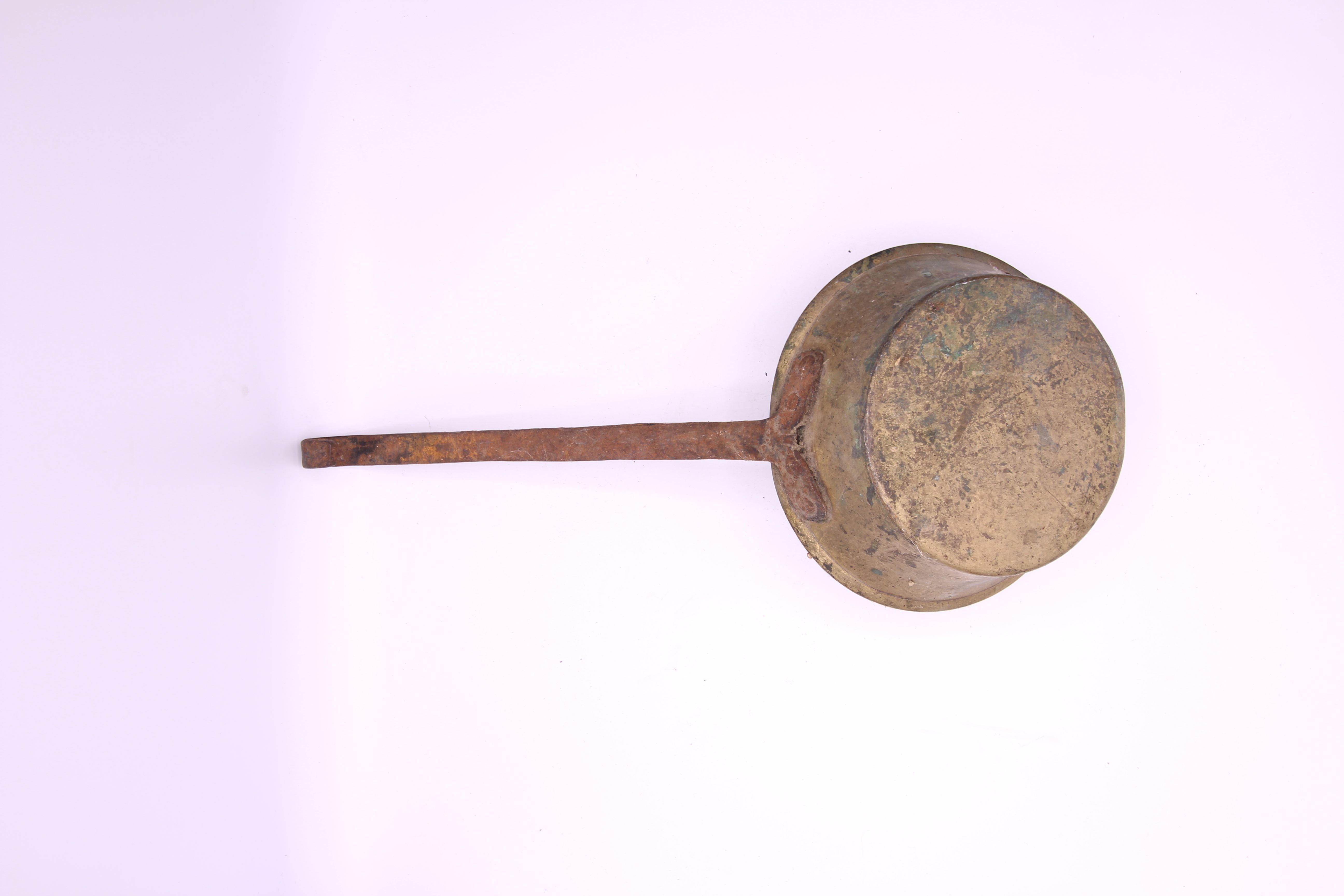 Recipiente in rame di forma cilindrica, leggermente più ampio sul bordo rispetto alla base e provvisto di un lungo manico ricurvo all'estremità in modo da poter essere appeso