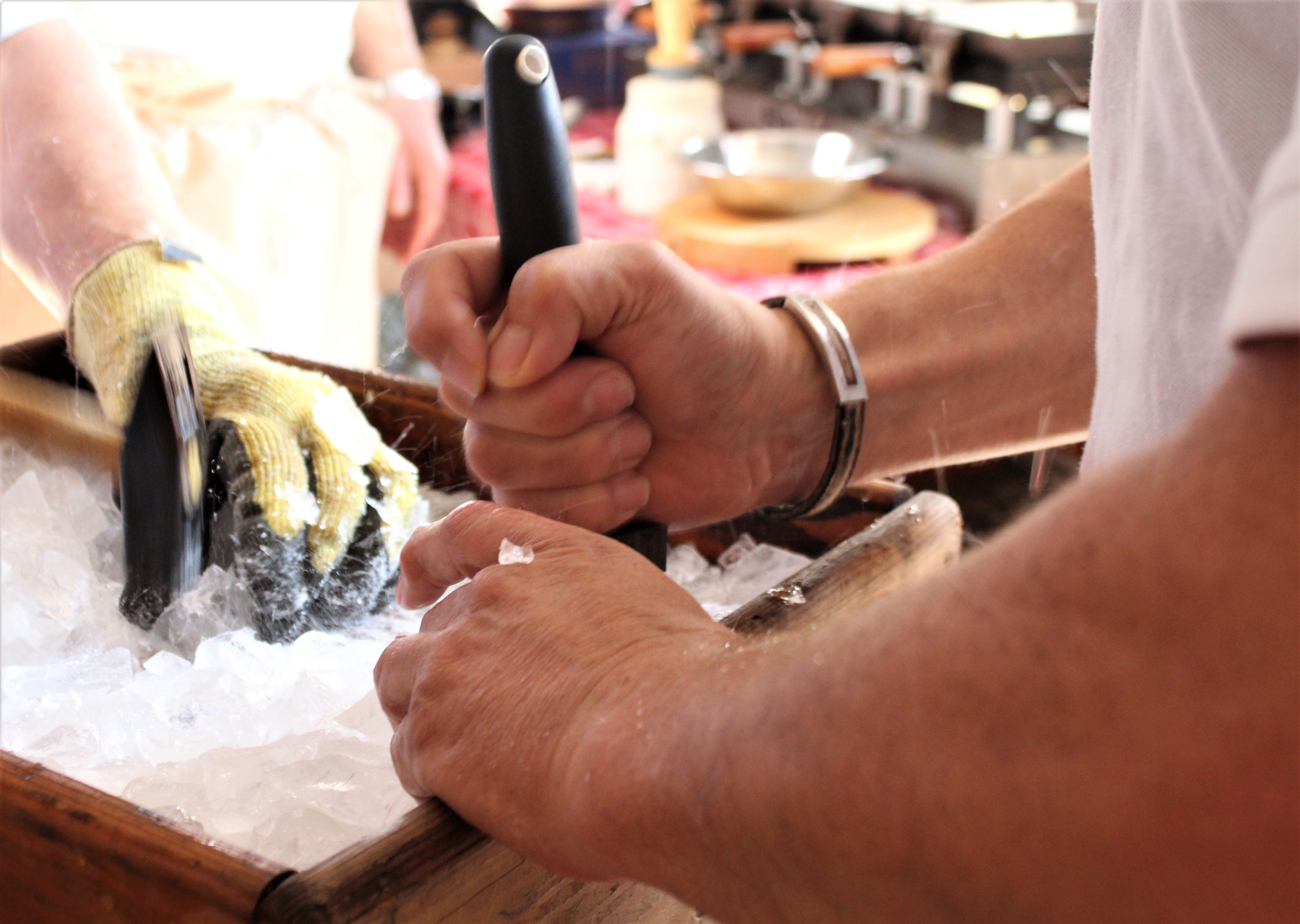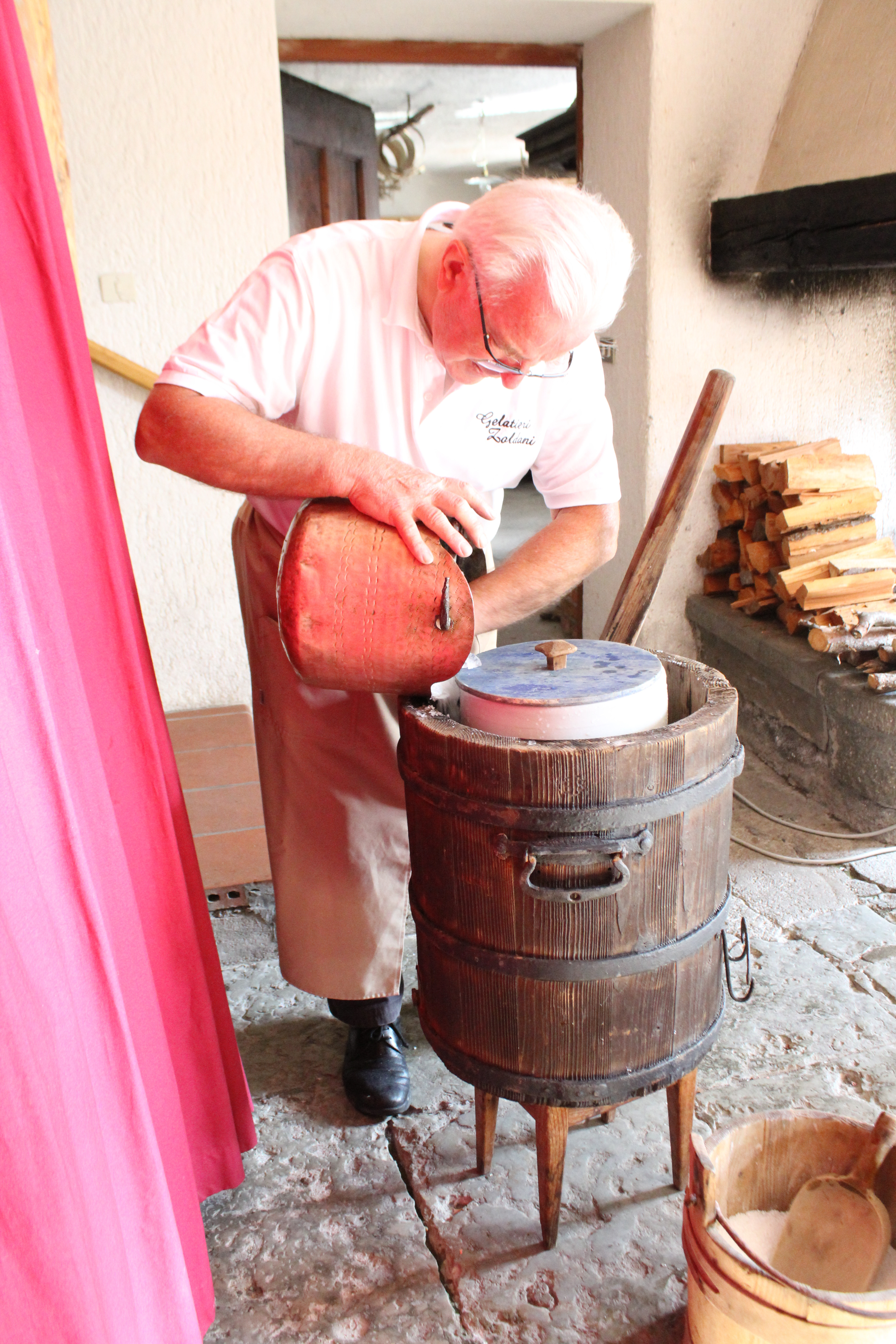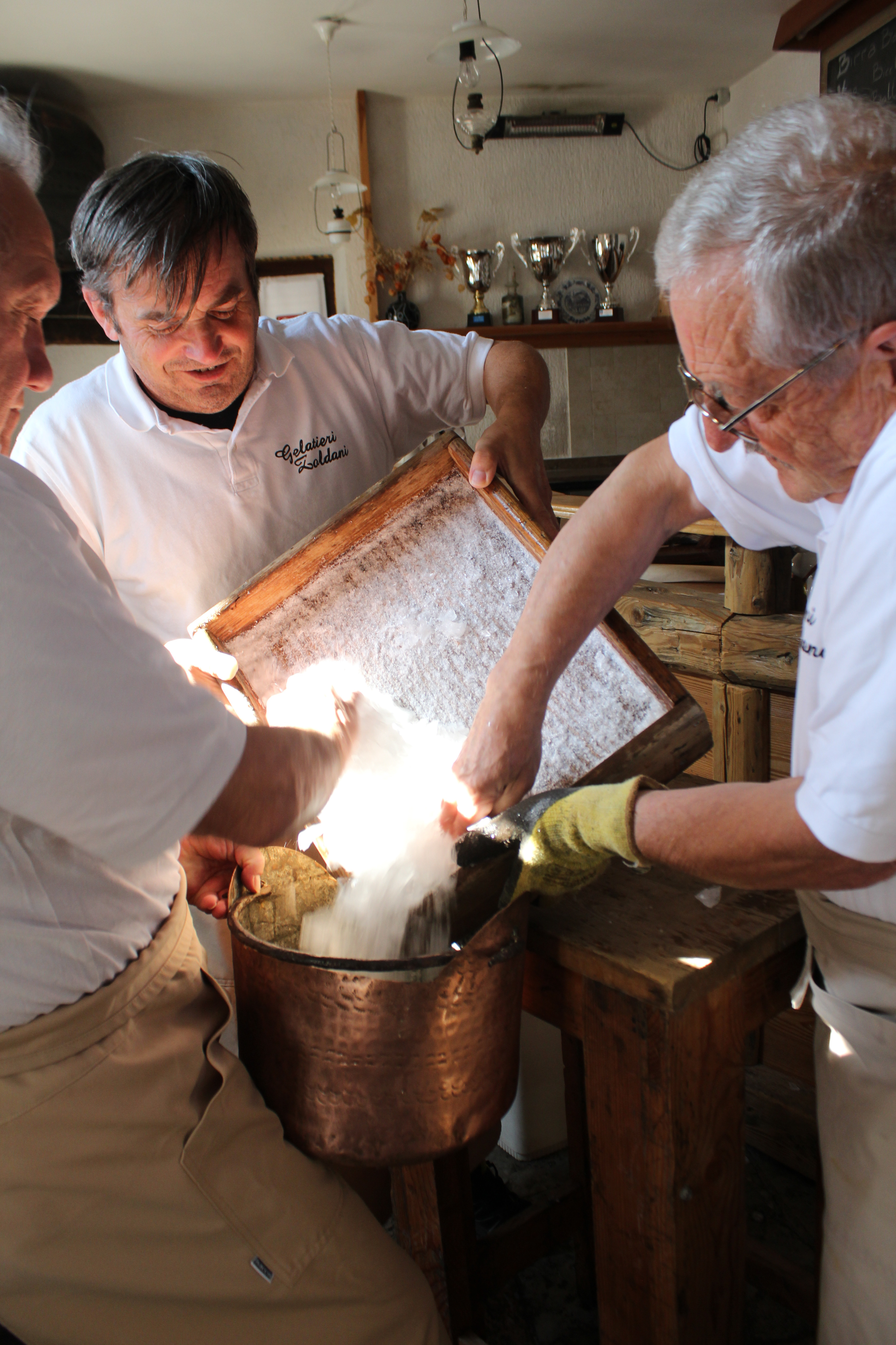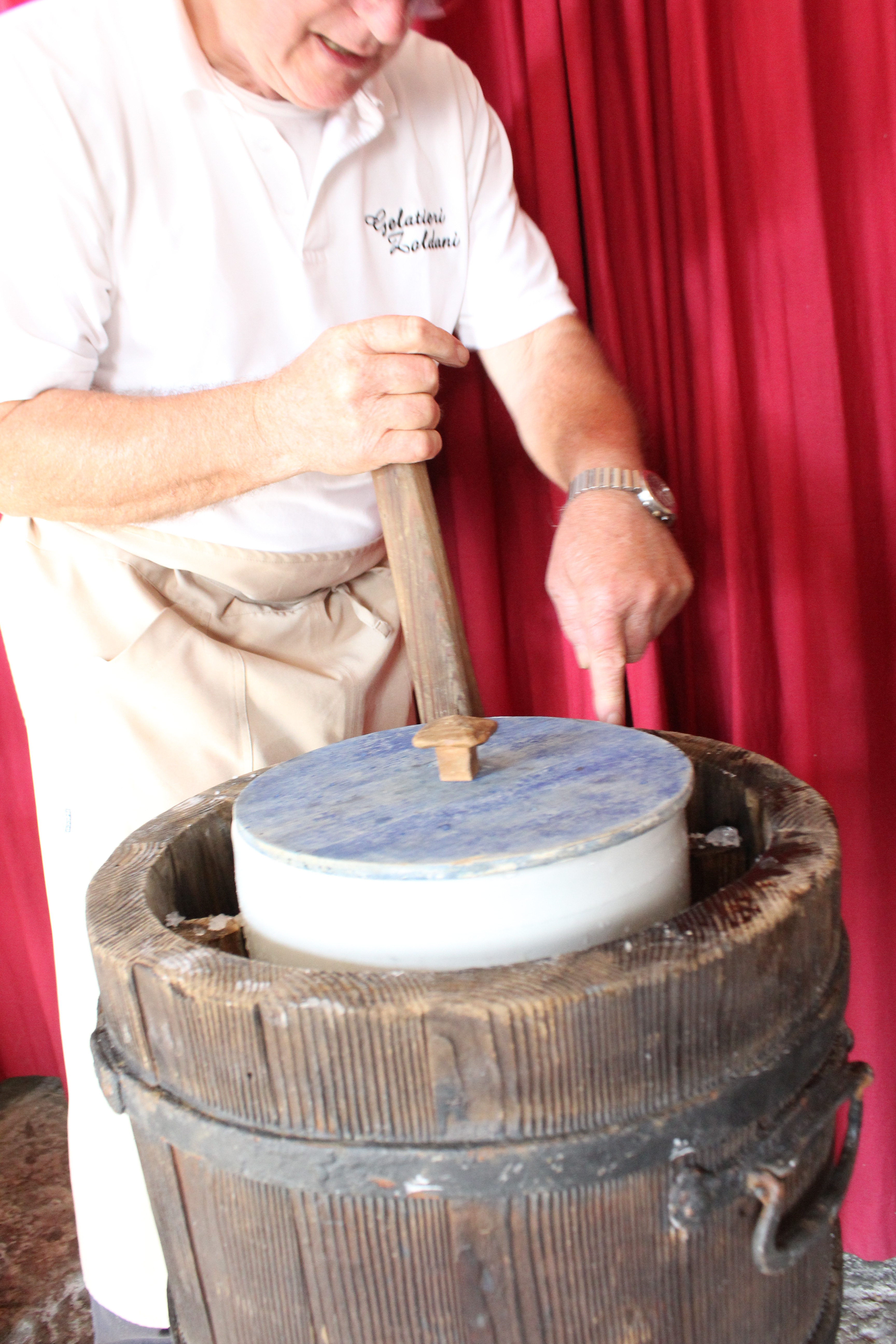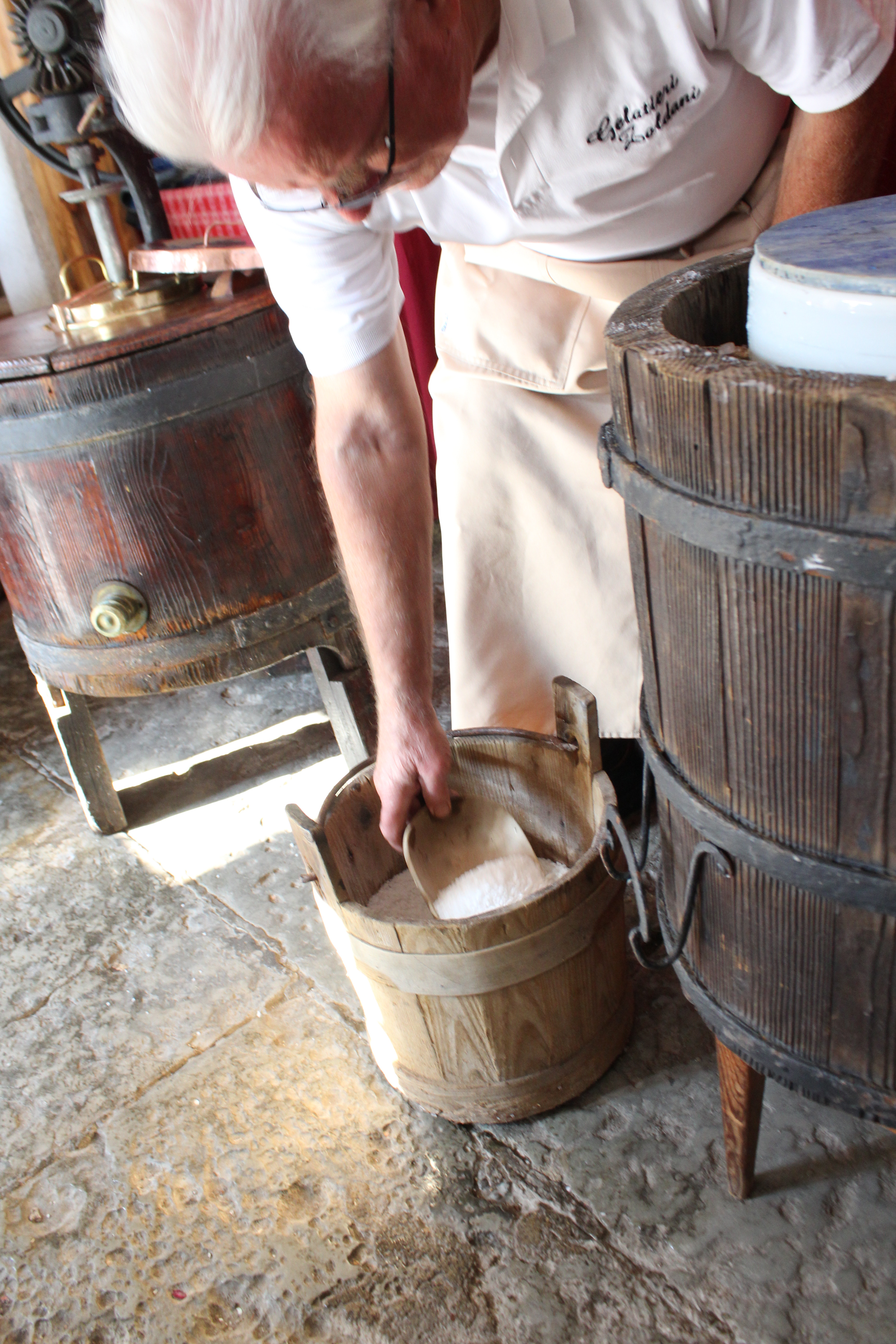 Viene aperta la copertura dell’intercapedine tra mastello in legno e la carapina di ceramica #sorbettiera#, quest’ultima invece resta chiusa da un coperchio in legno. Vengono anche predisposti un secchio di legno con sale, una sessola e un bastone dentro l’intercapedine. Due gelatieri, in piedi, uno di fronte all’altro, stanno frantumando del ghiaccio. In mezzo a loro è posizionato un piedistallo con sopra un vassoio in legno con bordi alti in cui è contenuto il ghiaccio da rompere. Il primo lo rompe avvalendosi di un martello, il secondo lo scalfisce e lo frantuma con l’uso di uno strumento dotato di rebbi in metallo. Man mano che il ghiaccio nel vassoio è pronto, viene versato in un secchio di rame. Un altro gelatiere porta il secchio alla #sorbettiera# e inizia a creare la soluzione refrigerante. Per fare ciò versa il ghiaccio frantumato nell’intercapedine presente tra il mastello in legno e la sorbettiera in metallo del mantecatore. Dopo aver distribuito il ghiaccio preleva con una sessola in legno un po’ di sale da un secchio e lo distribuisce dove in precedenza aveva versato il ghiaccio. Subito dopo, con l’ausilio di un bastone in legno, inizia a pestare con forza la soluzione di ghiaccio e sale per far sì che le due sostanze si mescolino, si compattino e si distribuiscano uniformemente; mentre pesta la soluzione, si sposta tutt’intorno all’intercapedine, avanti e indietro. La #sorbettiera# ha l’imboccatura sempre chiusa e protetta dal coperchio in legno in modo che la soluzione non vi entri. Questa sequenza di operazioni si ripete più volte, anche con l’aiuto di un quarto gelatiere nel portare avanti e indietro il secchio del ghiaccio, fino al completo riempimento dell’intercapedine. A questo punto l’intercapedine viene chiusa con due coperchi a semicerchio in legno con pomelli e il coperchio della #sorbettiera# viene sostituito da uno in rame