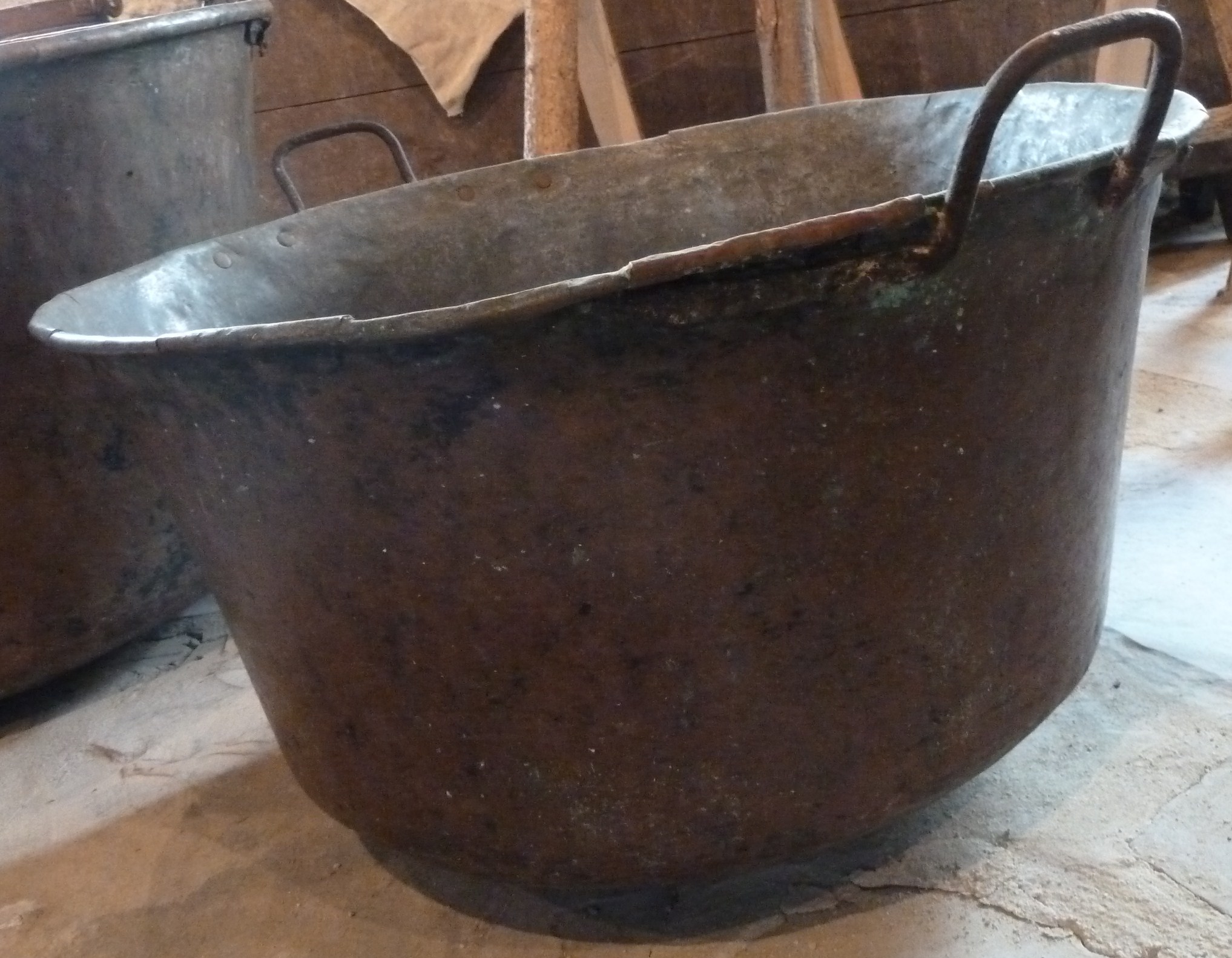 Paiolo in rame stagnato dotato di coperchio divisibile in due semicerchi. al centro di uno di questi semicerchi è presente una cavità quadrata, cm 23x23, utilizzata per versare il latte nel paiolo a coperchio chiuso. Il paiolo è inoltre dotato di due manici laterali