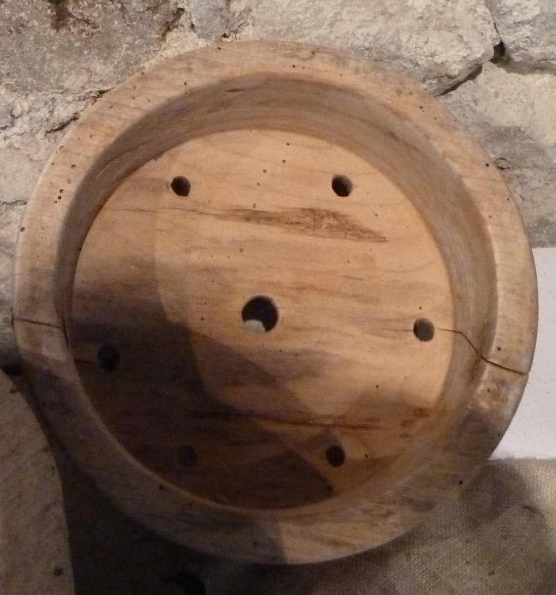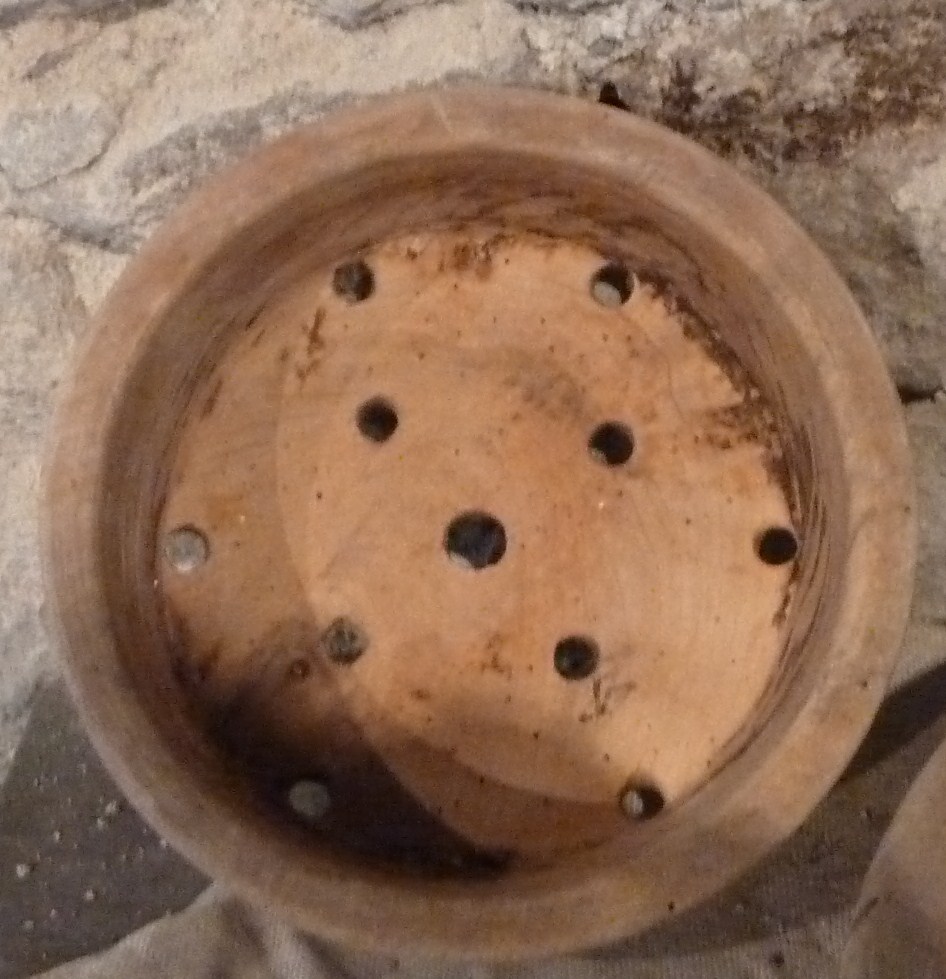 Contenitore a sezione circolare, dalla sponda bassa e dalla circonferenza della bocca rilevata maggiore di quella del fondo, su cui sono stati ricavati dei piccoli fori