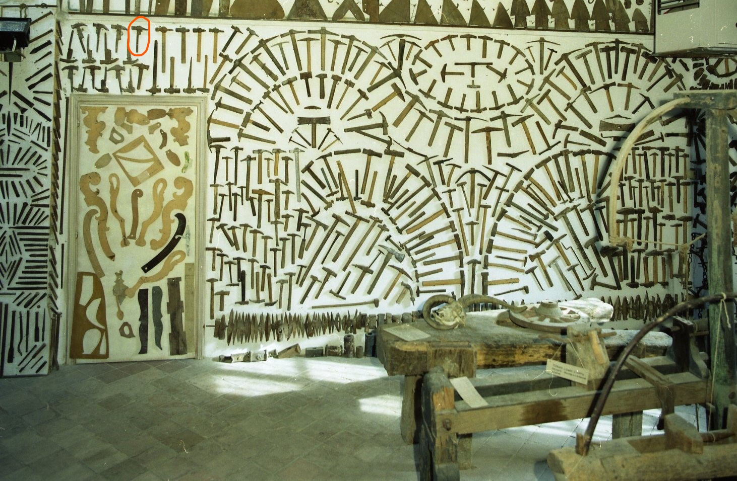 Martelli da aratro, fissati con chiodi e filo di ferro al di sopra della porrta di ingresso della stanza E "Stanza delle scarpe e delle scimmie" e disposti su quattro file, intersecantesi due a due nella parte dei manici, uno dei martelli ha il manico in legno, non originale