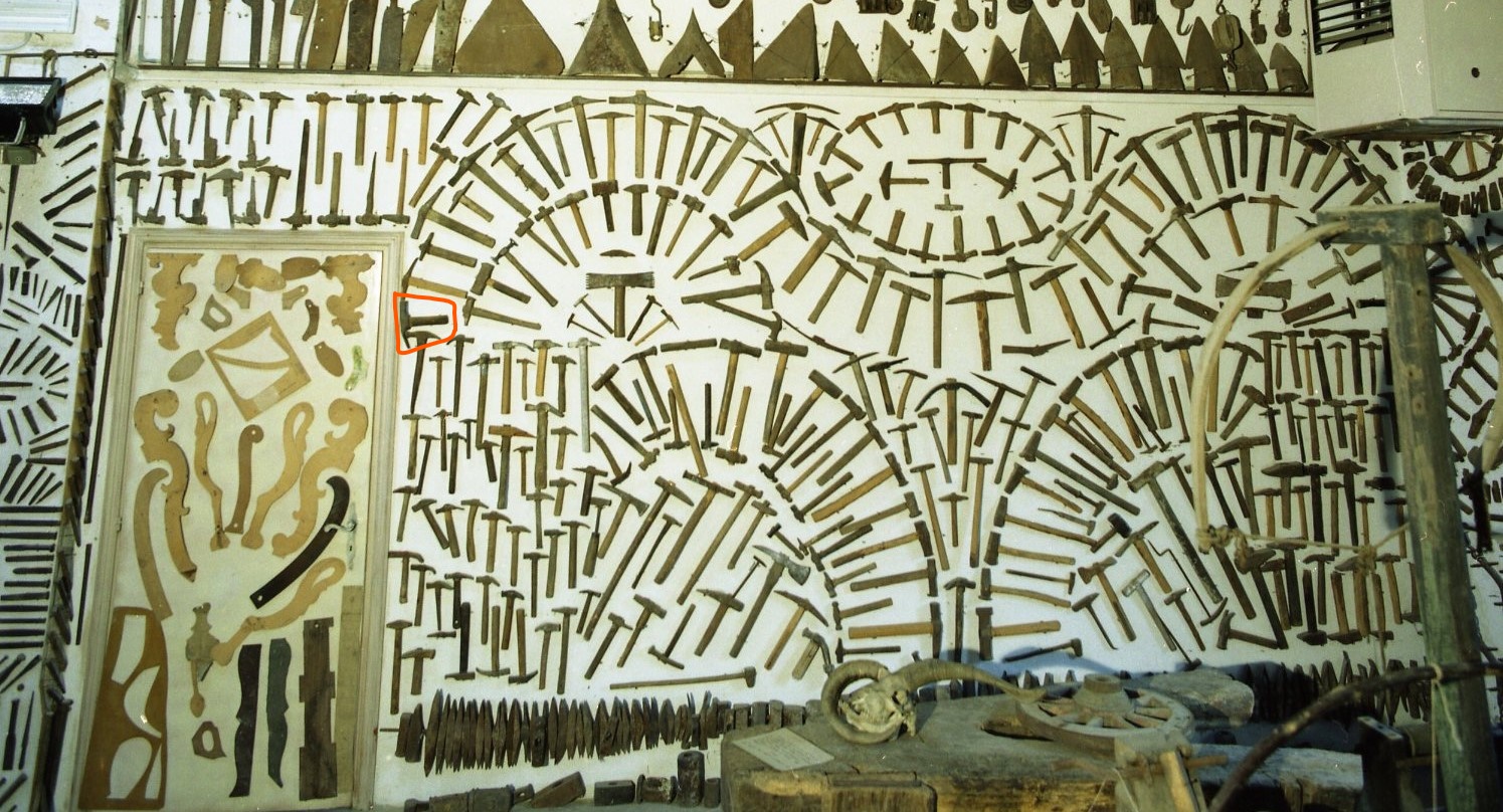 Martelli fissati alla parete con chiodi e filo di ferro e variamente posizionati: il primo a destra della porta di ingresso della stanza E "Stanza delle scarpe e delle scimmie", gli altri due vicino allo spigolo destro della parete in alto. Martelli con la testa (#testa#) a sezione quadrata e la penna (#pèn'na#) sagomata in modo tale da essere una piccola zappa