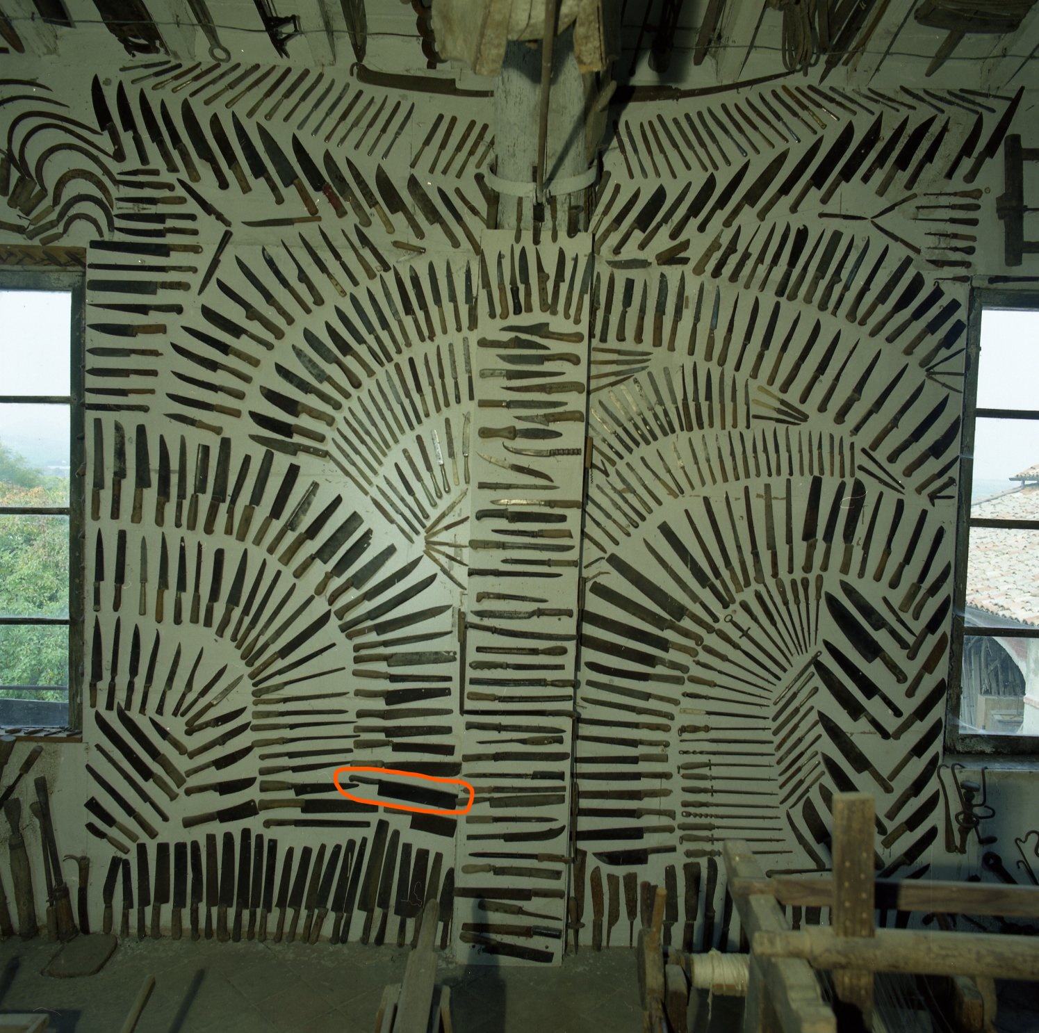 Dice Guatelli: "di poche pareti si può dire che siano state fatte una volta e lasciate lì... Questa è stata ritoccata pochissimo: è un oggetto, il coltello, con cui comporre è facile." (1996). In particolare spiega: "In cucina i contadini avevano pochi coltelli e la