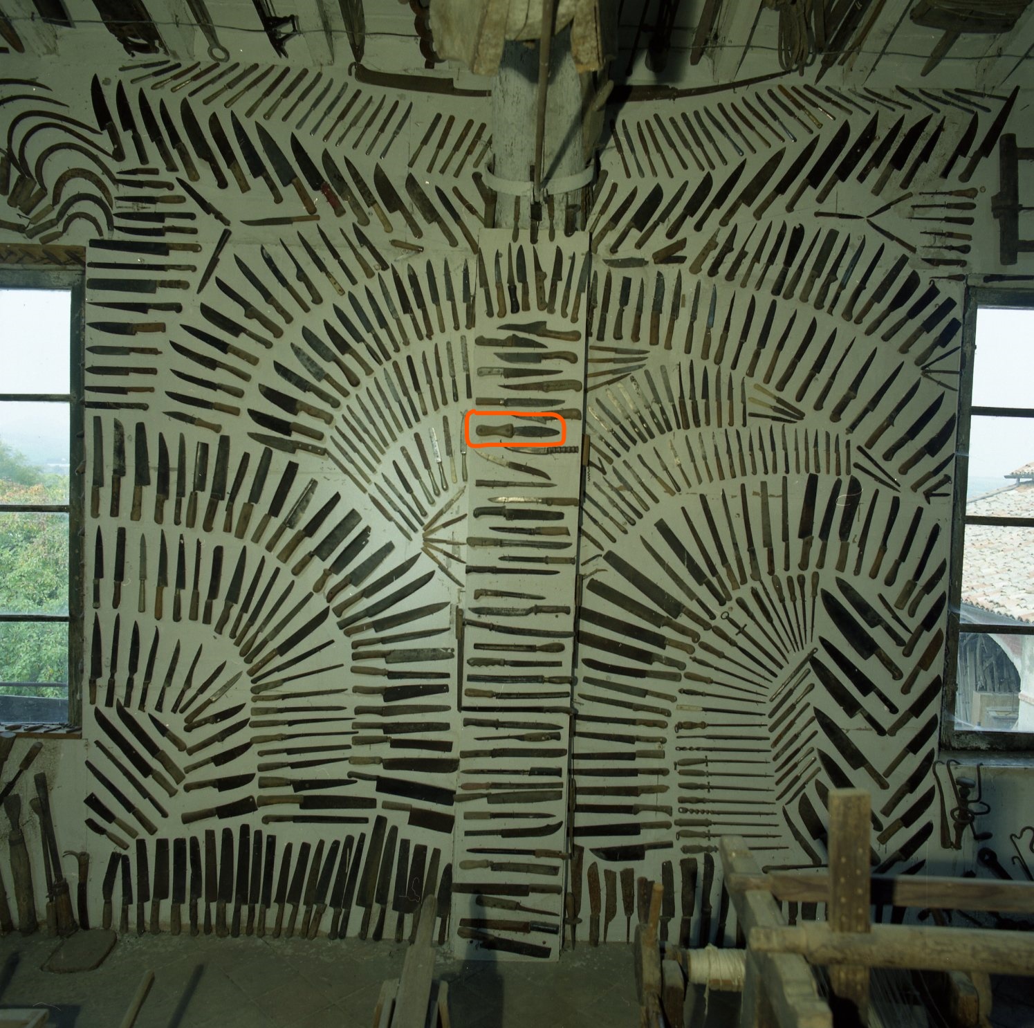 Lama tendenzialmente stretta con, a un'estremità, un breve manico di legno. L'oggetto presenta un asse di simmetria centrale in quanto la lama, che può essere di diverse lunghezze, presenta sempre una punta acuta e quasi sempre due taglienti, e il manico, che parte dal centro del lato opposto alla punta, è privo di un verso d'impugnatura. L'insieme forma, con altri oggetti, una linea curva e due verticali e una orizzontale a pavimento, e partendo dall'alto a sinistra, è costituito, nella nona linea curva dal terzo pezzo; nella seconda linea verticale dai pezzi 8; 11; 32; nella terza linea verticale dal 3; nella fila a pavimento dal primo della parte destra