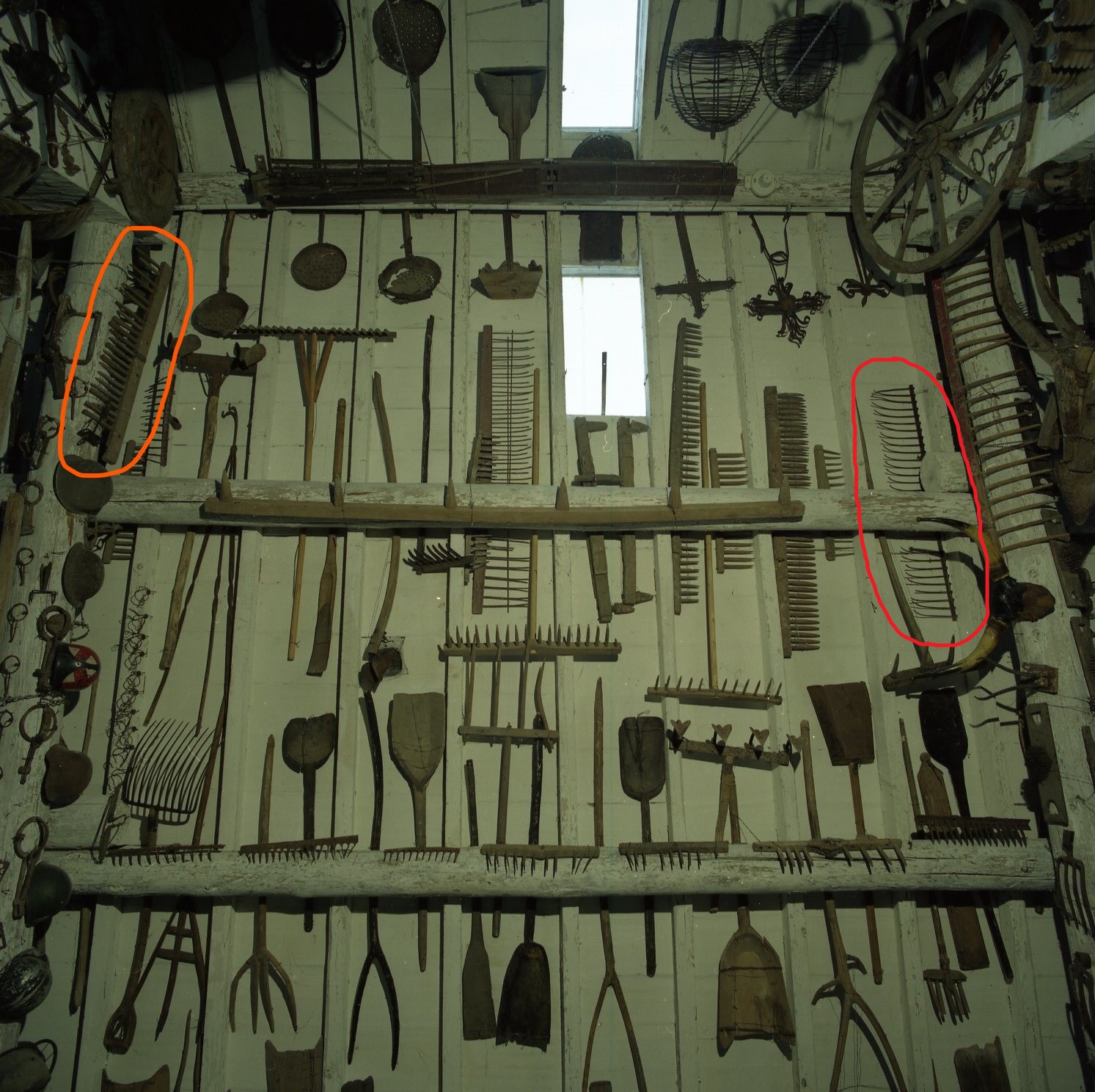 Parte di rastrello costituita da un lungo regolo di legno o ferro a cui andrebbe perpendicolarmente fissato il manico. Nel regolo sono infissi numerosi denti tendenzialmente lunghi e appuntiti, di legno o di ferro. Quelli di legno sono dritti, quelli di ferro sono arcuati. L'insieme ha l'aspetto di segmenti verticali e paralleli e è costituito nel settore 23: da un pezzo posto al confine del settore 5; nel settore 5/6: da due pezzi nella quinta campata, due nella settima, due nell'ottava e uno nella nona