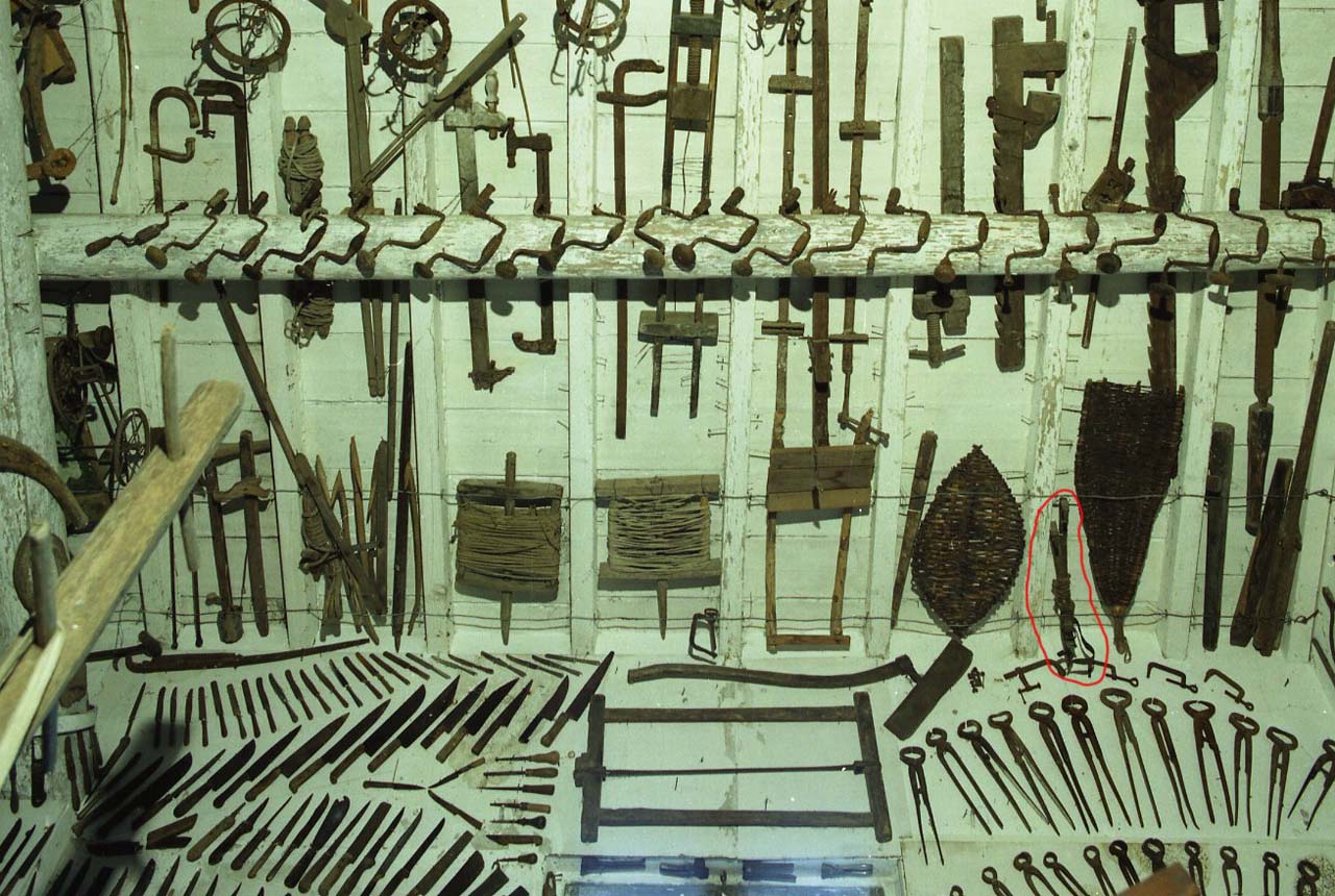Piattina di accaio curvata a cui è fissata una cinghia in cuoio per il fissaggio al basto. I beni sono vicini e bloccati insieme tramite le cinghie di cuoio