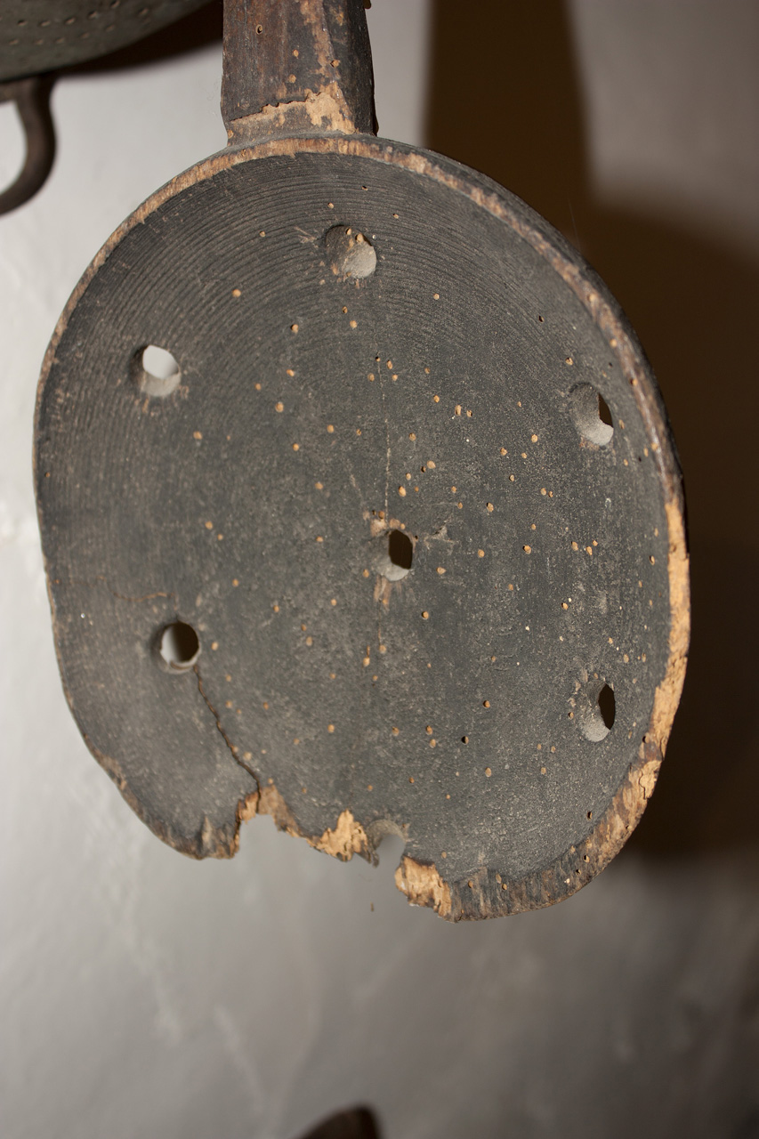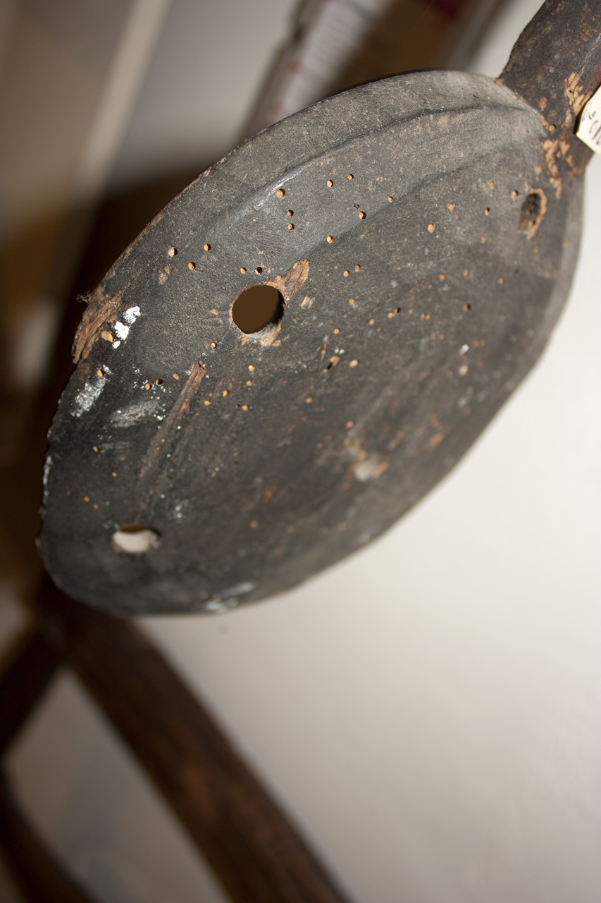 La base forata è circolare, alla quale è unito un manico spesso. Tutto in legno