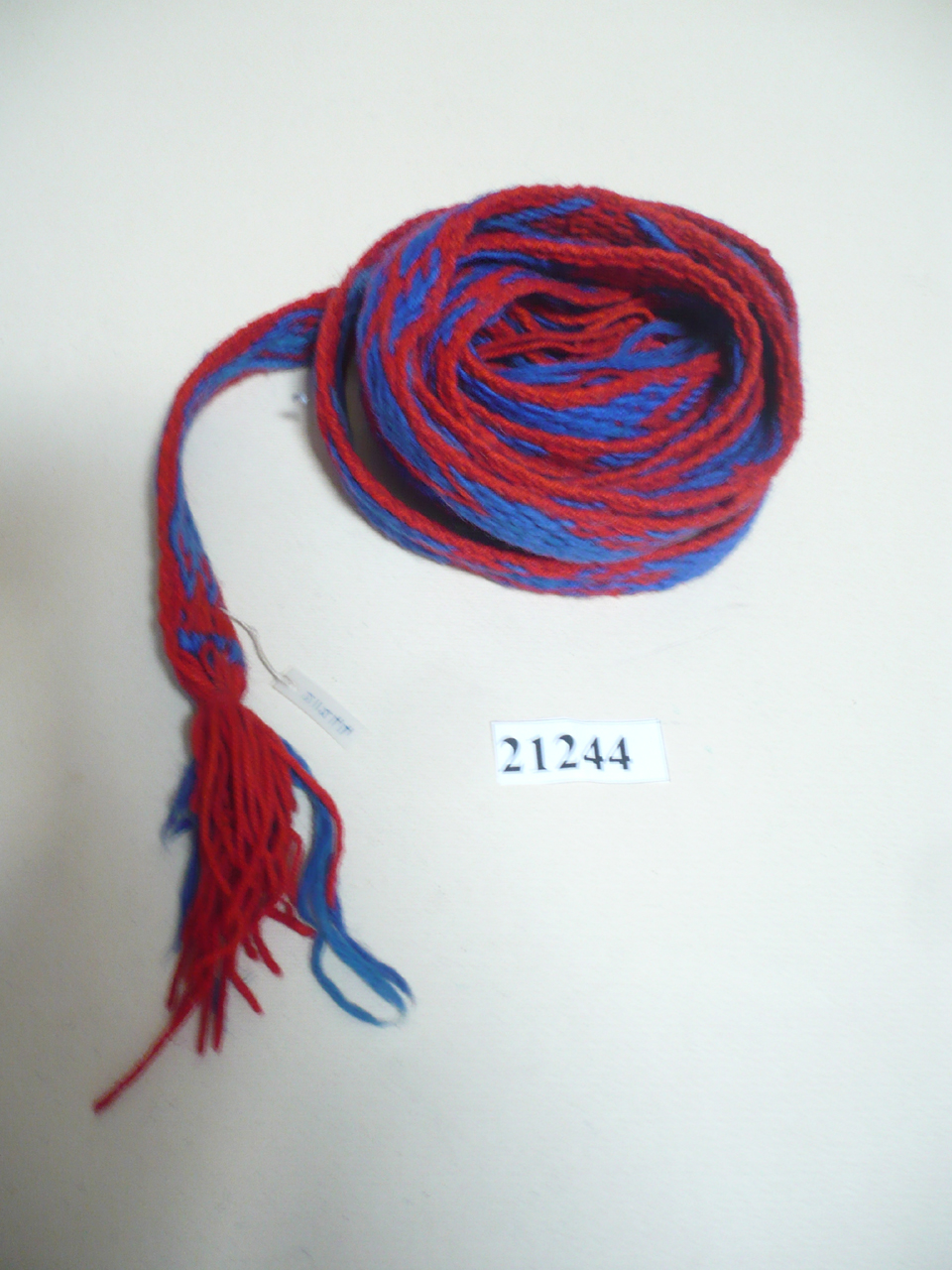 Cintura di lana di colore blu e rosso, realizzata a mano, con nappe terminali