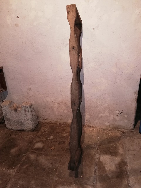 Struttura lignea di forma rettangolare irregolare composta da due stanghe parallele a sezione quasi rettangolare, che tendono a convergere a una delle due estremità. Entrambe le estremità sono chiuse da una traversa lignea. Due traverse metalliche a sezione circolare sono presenti a circa un terzo e a due terzi della struttura; vi sono annodate due cordicelle di canapa utilizzate per fissare i barili tramite legatura