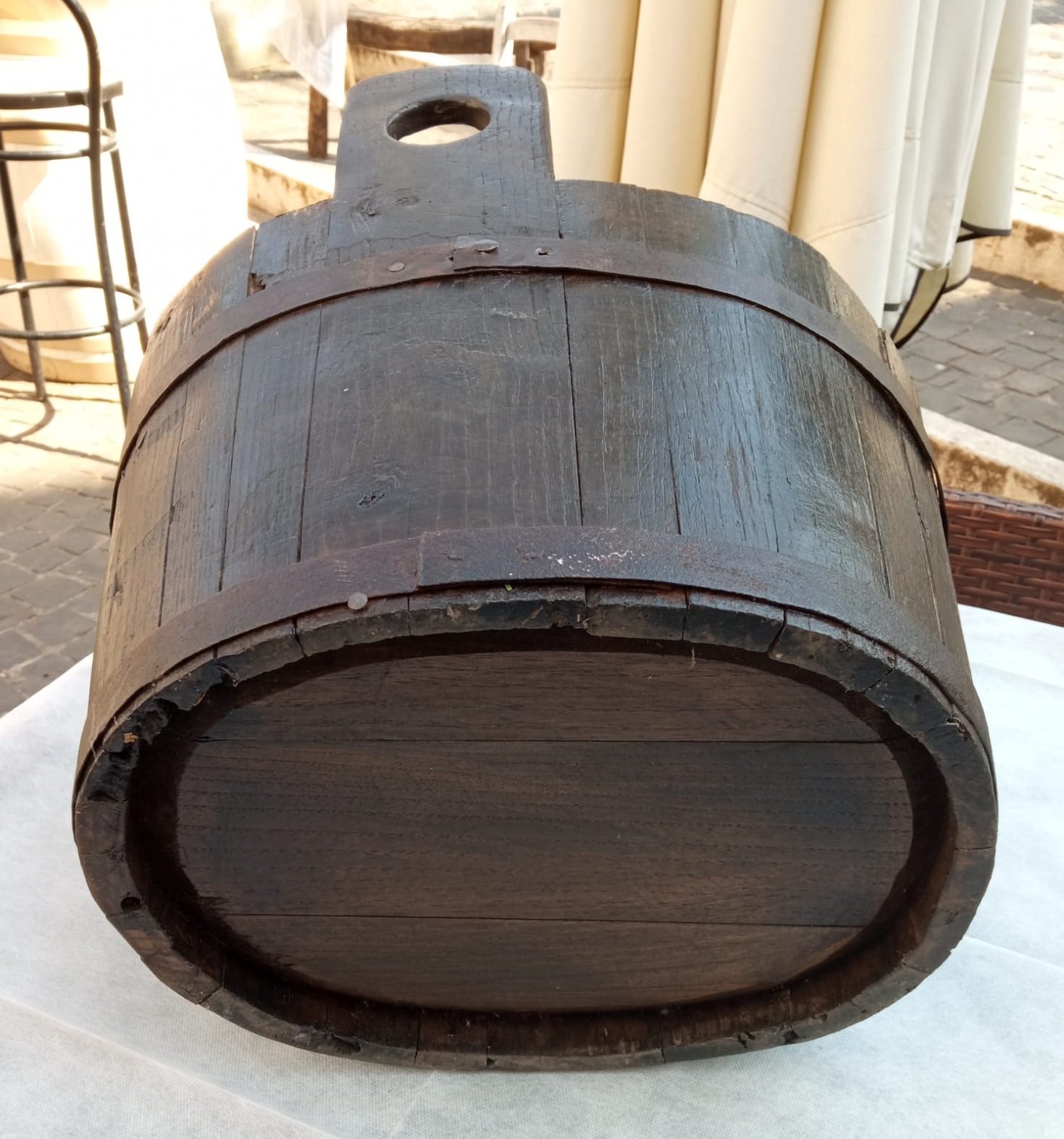 Recipiente ligneo a base ellittica costituito da doghe a sezione trapezoidale mantenute aderenti da 2 cerchi metallici (uno all’estremità superiore e uno in quella inferiore) fissati con chiodi ribattuti; è provvisto di due manici a sezione rettangolare che presentano un grande foro circolare ciascuno (prese)