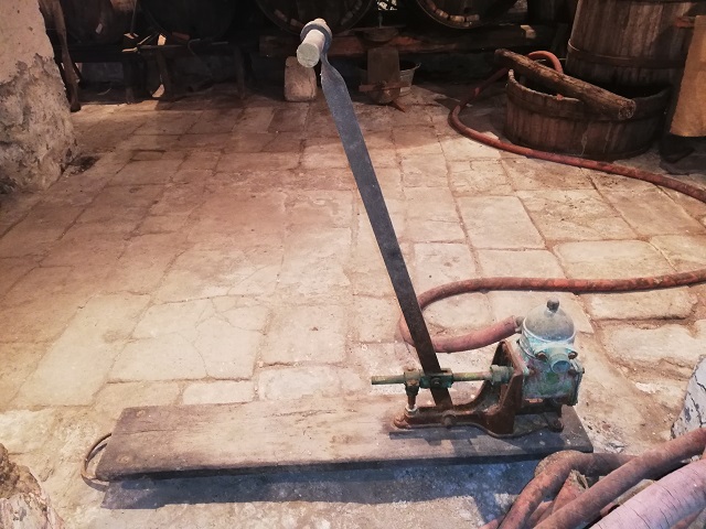 - FUNZIONE E MODALITÀ D'USO pompare il vino da una botte all’altraInseriti due tubi rispettivamente nei bocchettoni aspirante e premente, si azionava manualmente la pompa con la leva metallica in modo da mettere in funzione l’ingranaggio che a sua volta azionava il pistone e quindi la pompa stessa, permettendo così il travaso del vino da una botte all’altra