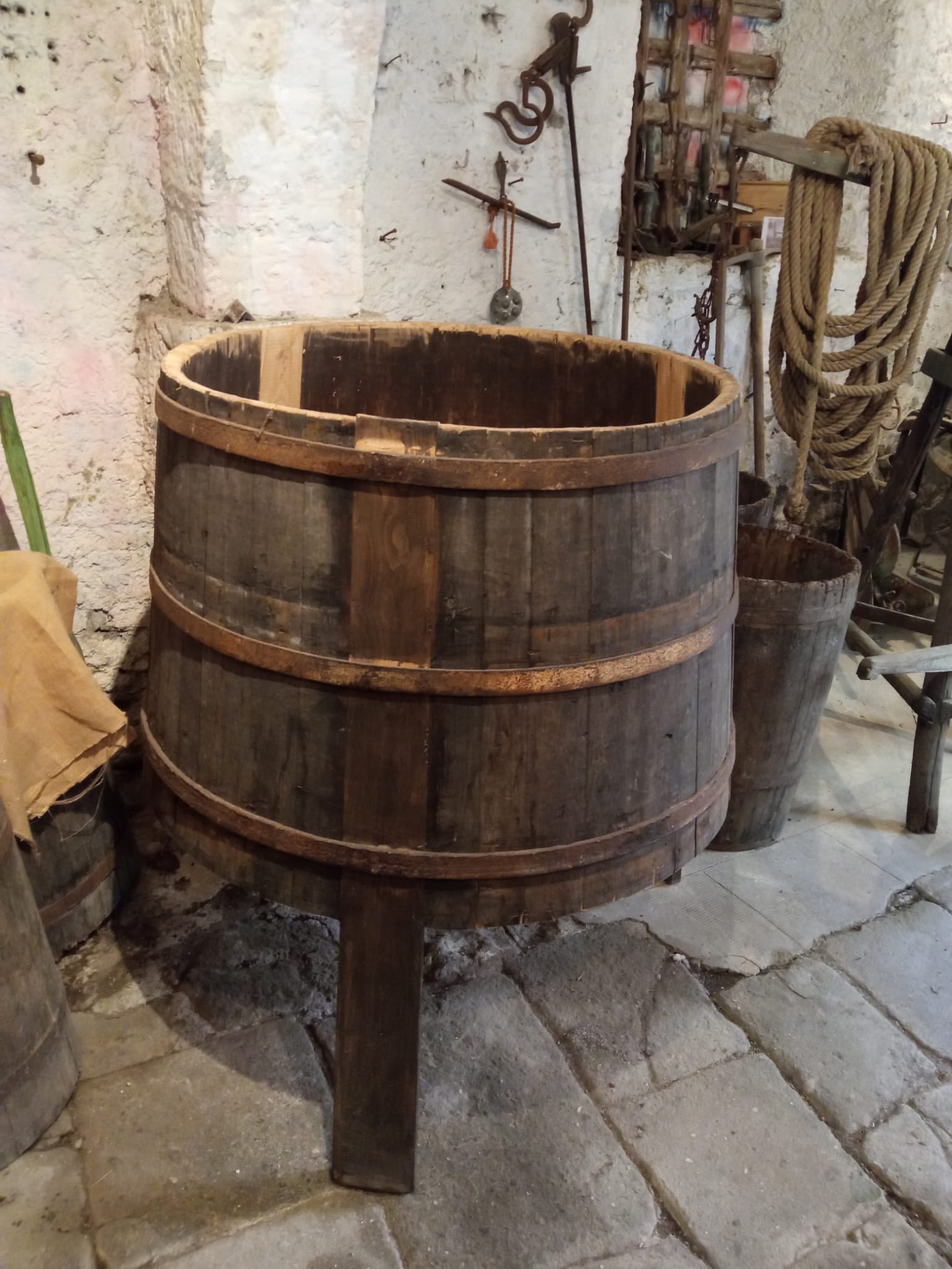 Recipiente ligneo tripode costituito da doghe lievemente arcuate a sezione trapezoidale, mantenute aderenti da 3 cerchi metallici. I piedi sono ricavati dal prolungamento di robuste doghe ed equidistanti l’uno dall’altro. È provvisto di due grandi fori circolari aperti verso la parte esterna del fondo, posti a uguale distanza tra due piedi