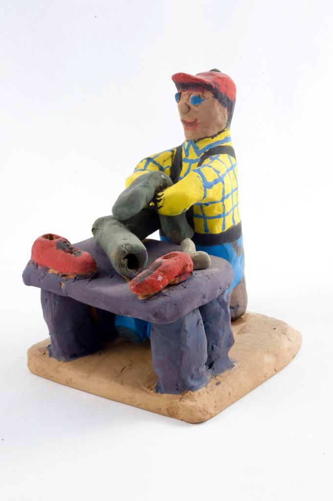 la scultura, su base sagomata squadrata, raffigura un calzolaio nell'atto di riparare uno stivale. Il calzolaio è in piedi davanti il tavolo di lavoro, indossa un pantalone blu, una camicia gialla con motivi a rete blu, un cappello rosso con visiera. Sul tavolo sono un paio di scarpe rosse e uno stivale. Il dispositivo sonoro tubolare, a forma più o meno cilindrica, è applicato sulla base