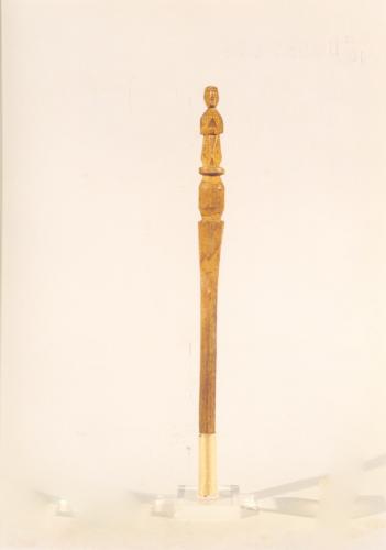 strumento con manico cilindrico slargantesi in alto e lieve rigonfiamento ovoidale. All'apice è una figura femminile con mani giunte