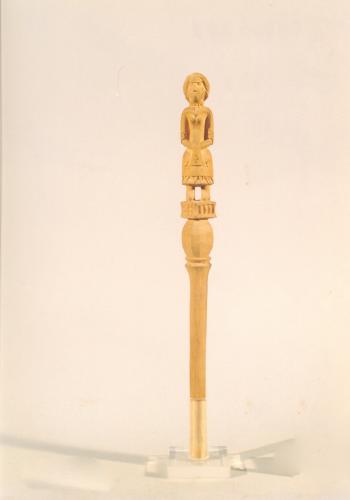 strumento con manico cilindrico e rigonfiamento ovoidale. All'apice è una figura femminile