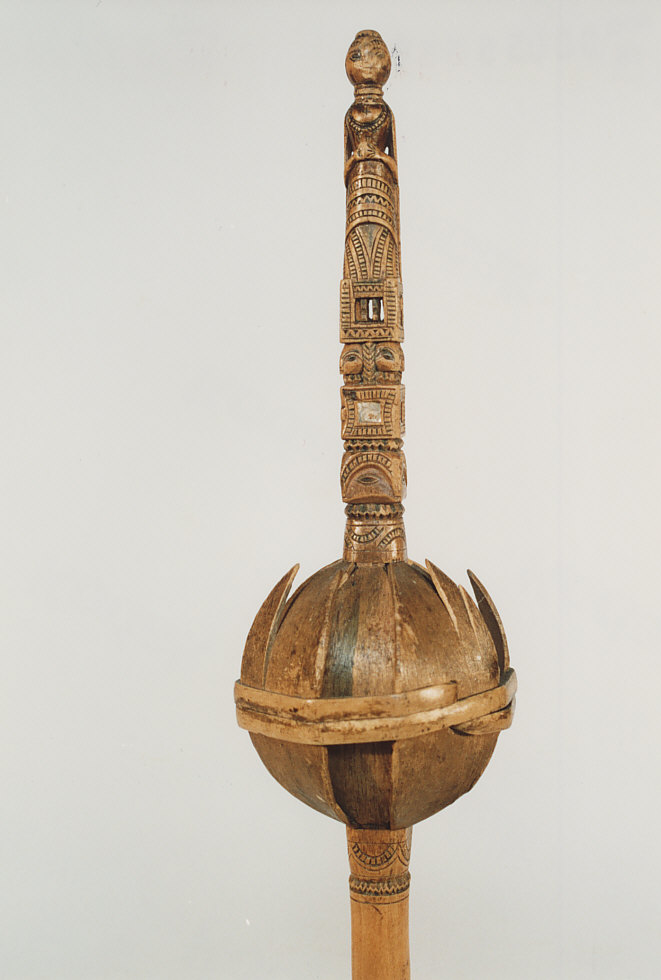 Manico cilindrico con piede inferiore. Rigonfiamento a stecche ad incastro con fascetta di contenimento e sassolini all'interno. Parte terminale costituita da una figura femminile in piedi su una sedia su base sagomata