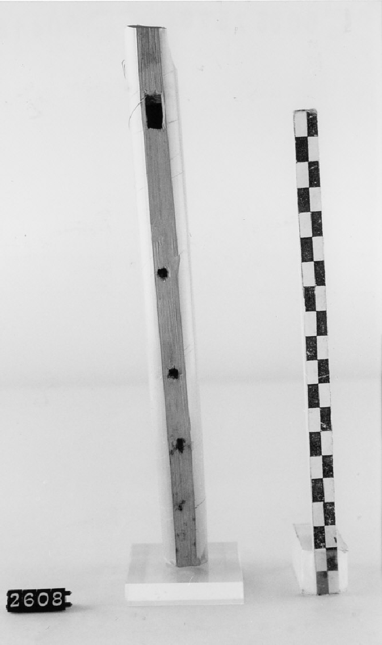 Tubo di canna. cilindrico, becco molto irregolare con zeppa di legno mal costruita e mal alloggiata.; finestra rettangolare molto irregolare dal labium non affilato, 3 fori anteriormente irregolari, tacche trasversali posizionano la finestra e i fori digitali. La canna è marcatamente piallata lungo i fori