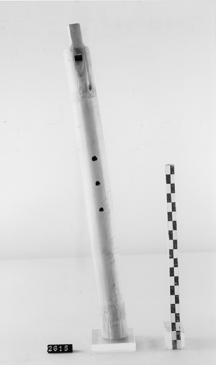Tubo di canna con becco sottile e sporgente munito di una zeppa di legno; possiede 4 fori digitali, 3 anteriormente e 1 posteriormente posizionato da una leggerissima tacca trasversale. Due nodi aperti lungo il tubo, al di sotto della finestra e presso l' estremità inferiore; è presente un' apertura triangolare posteriore/inferiore. Scritta a penna, indecifrabile, sulla superficie esterna della zeppa