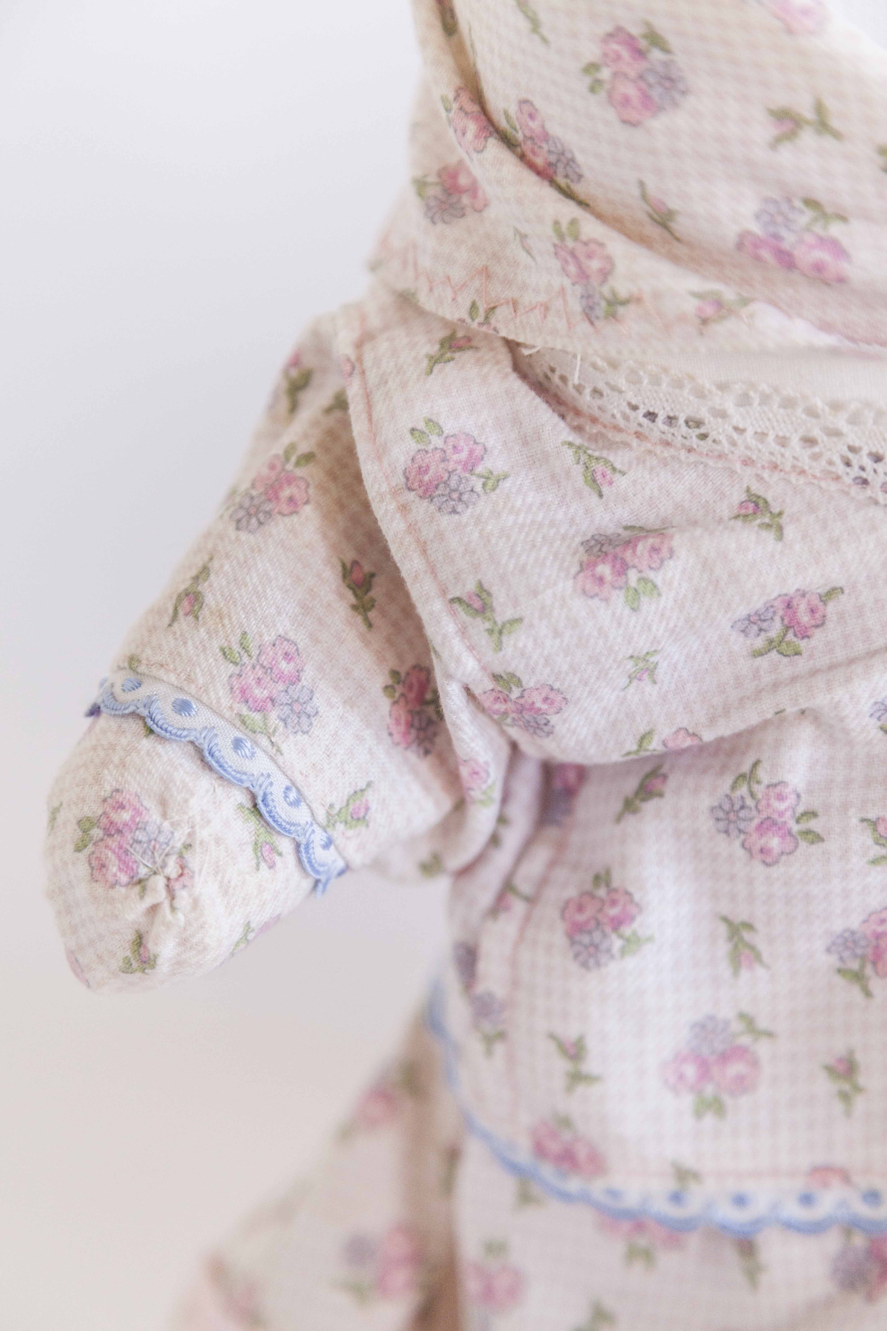 Gambe e testa del soggetto sono formate da un unico straccio bianco cucito. Gli abiti della bambola, gonna casacca e copricapo, sono realizzati con l'ausilio di una stoffa bianca con minute decorazioni floreali. La casacca è rifinita nei bordi con del pizzo bianco e azzurro e la gonna ha un bordino rosa