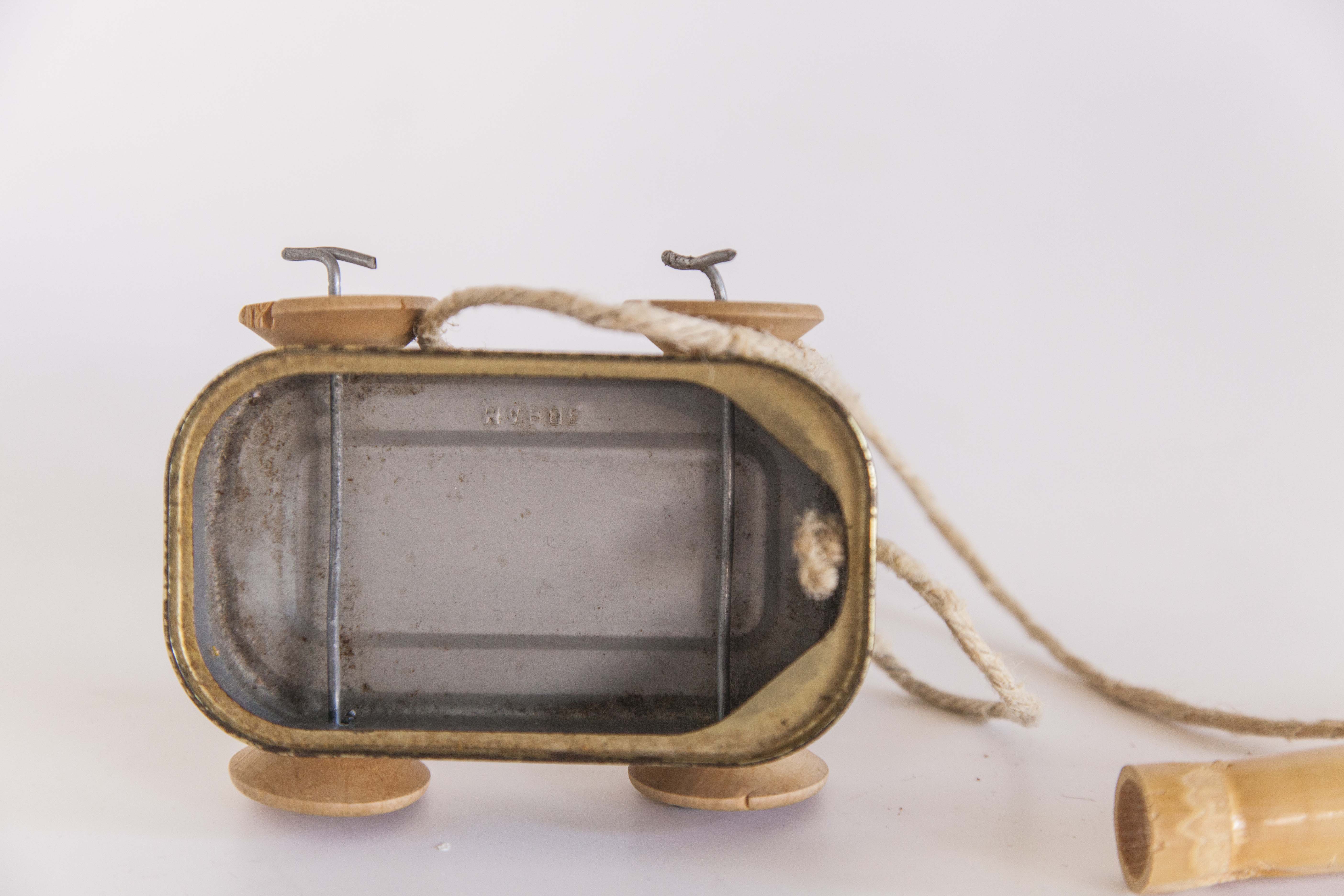 Macchina realizzata utilizzando una scatoletta di latta priva del coperchio, ai cui lati sono state applicate quattro ruote in legno, bloccate da un'asta metallica trasversale passante per i fori appositamente praticati, due per lato. In un ulteriore foro praticato sulla parte anteriore è stato poi infilato uno spago che termina con un pezzo di canna che funge da maniglia