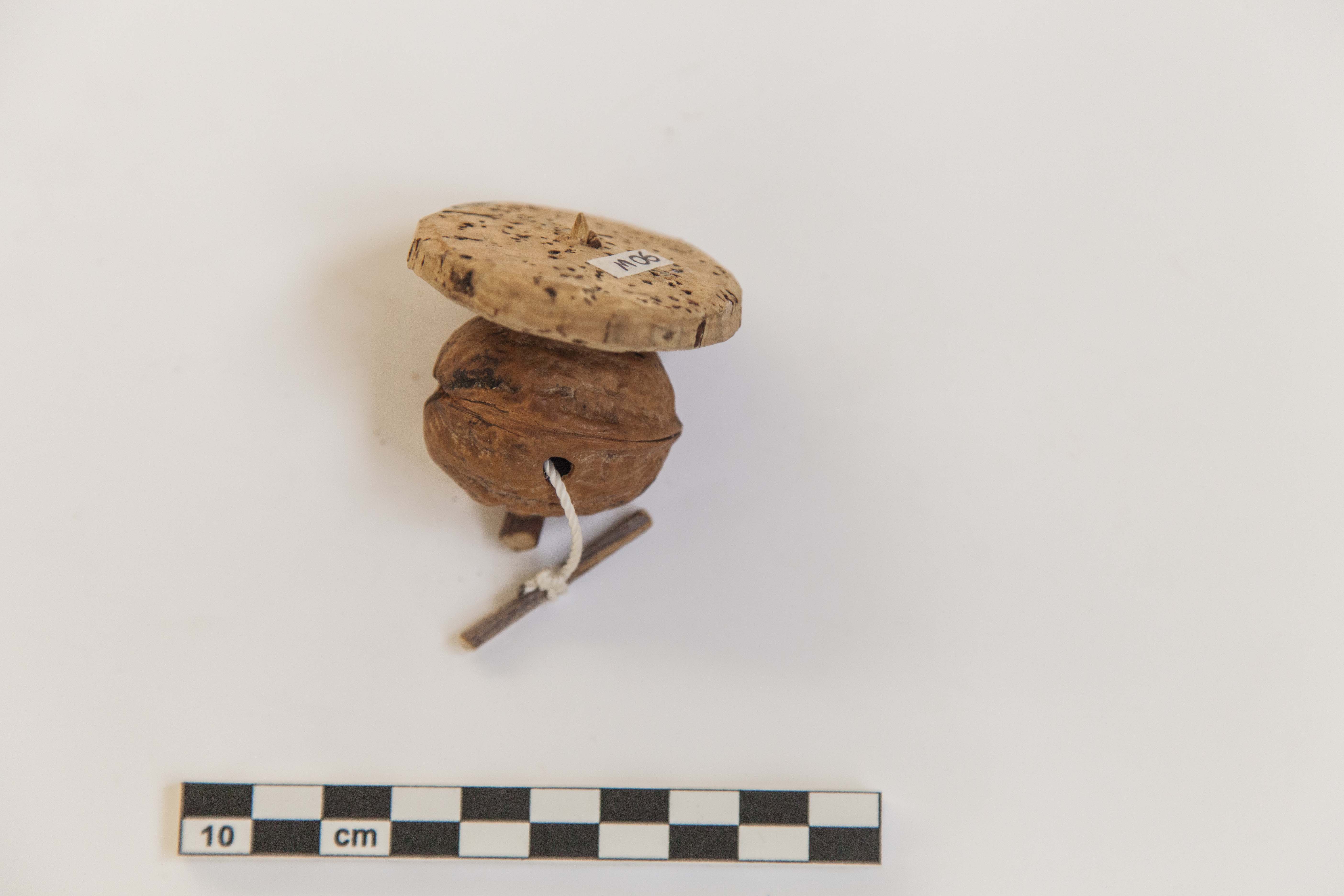 Il giocattolo è stato creato utilizzando un guscio di noce svuotato e incollato, con inserito all'interno un bastoncino di legno. Sono stati ricavati due larghi fori per consentire la rotazione del bastoncino al loro interno. Il bastoncino è fissato a una base circolare di sughero. Nel guscio si trova un ulteriore piccolo foro, attraverso il quale è inserita una cordicella, fissata ad un capo al bastoncino e all’altro a un’asticella di legno che funge da maniglia