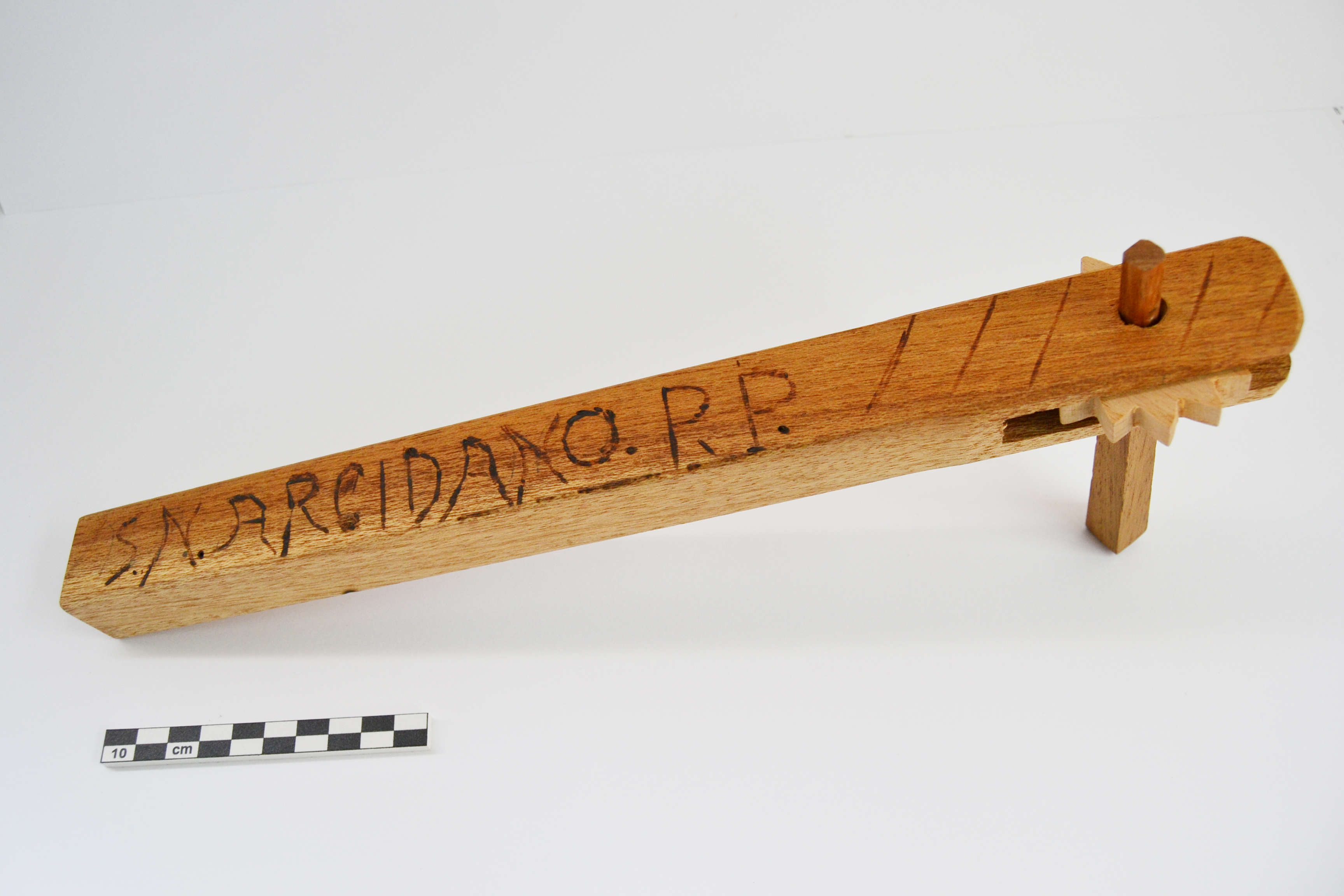 Giocattolo sonoro in legno costituito da un parallelepipedo cavo e completato da un’assicella, sottile e flessibile, che viene sollecitata da una ruota dentata fissata su un manico. Su una parete laterale il giocattolo presenta un'iscrizione pirografata recante, con tutta probabilità, il luogo di provenienza e le iniziali del costruttore