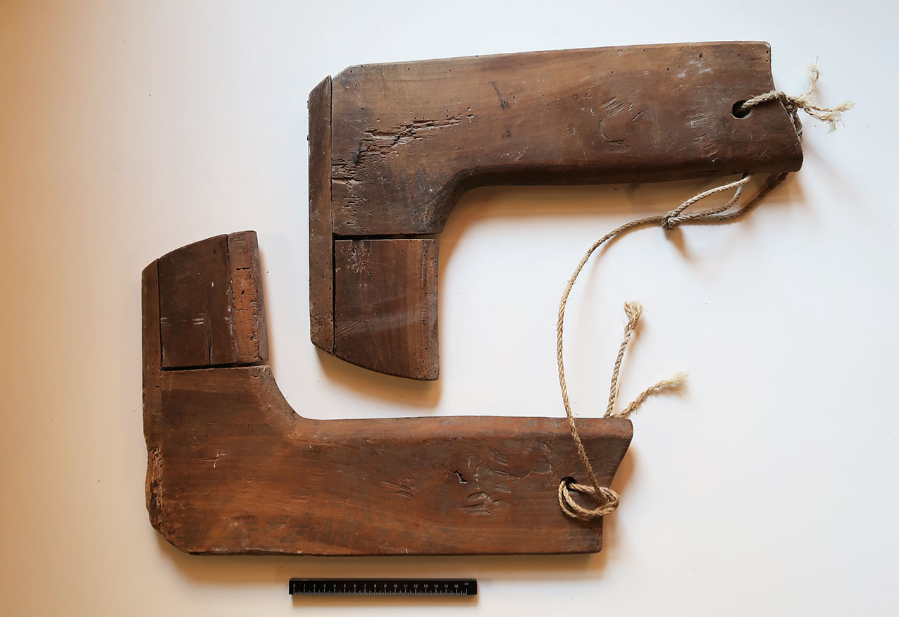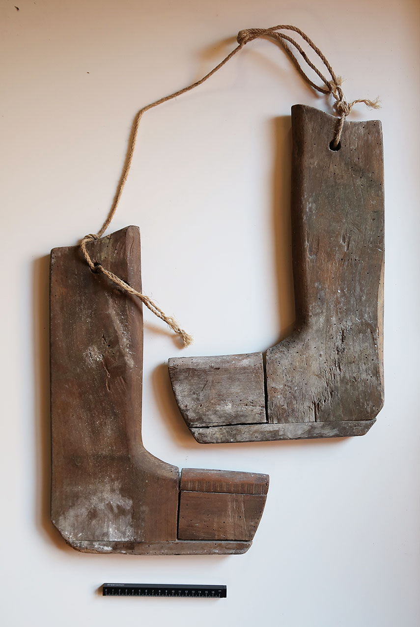 Coppia di sagome lignee a forma di piede e polpaccio (destro e sinistro) per la realizzazione di un paio di stivali da adulto su misura. Le sagome sono utili per la realizzazione dei gambali, mentre la forma del piede è realizzata utilizzando le apposite forme numerate