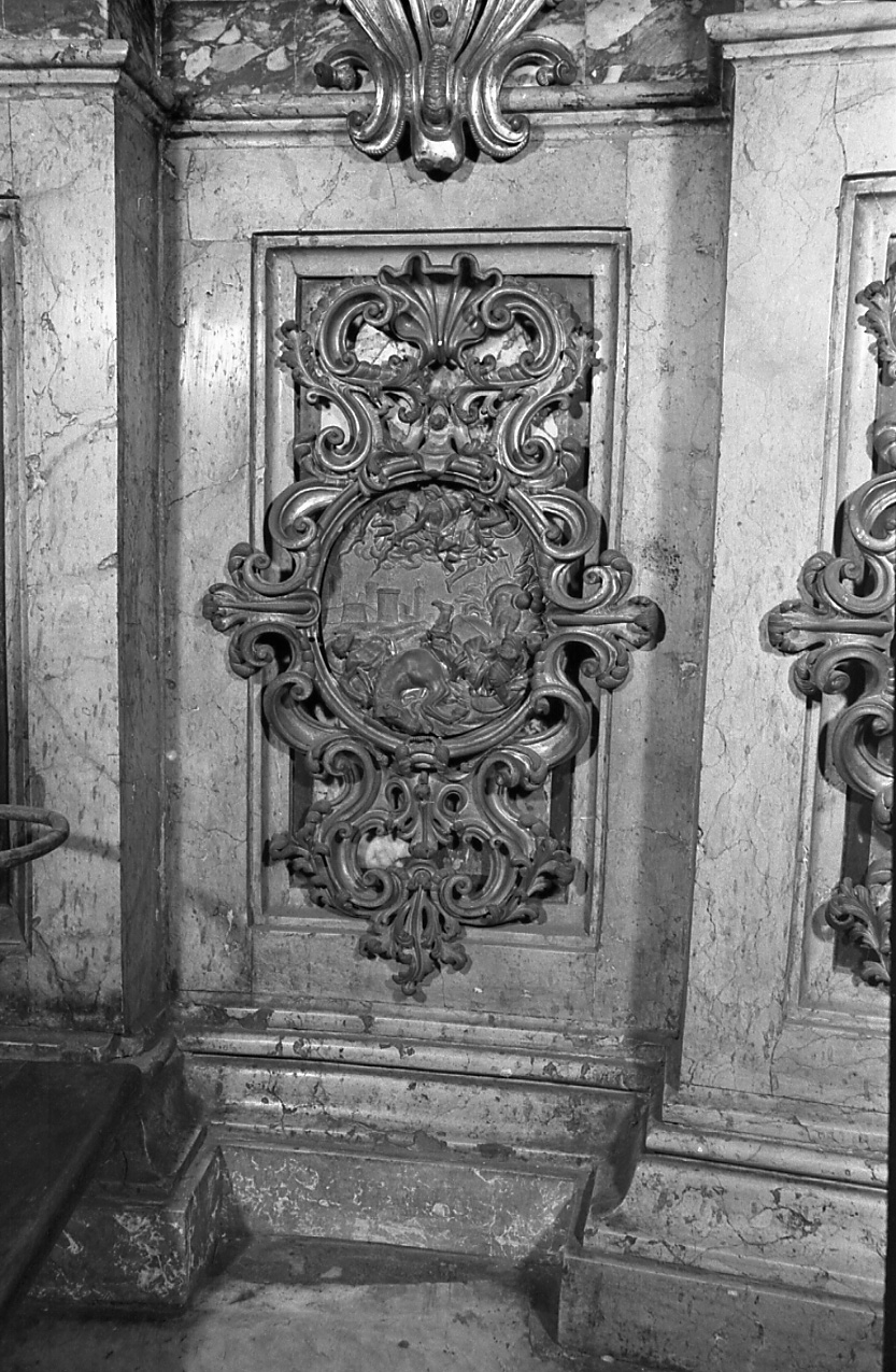 Il rilievo è modellato entro una formella ovale circondata da una cornice con foglie di acanto lateralmente, e trionfo vegetali, con volute, superiormente e inferiormente. Nella parte alta, tra nubi, sono rappresentati tre santi in vesti militari all'antica, muniti di scudi. Nella parte inferiore dell'ovale, in primo piano, sono rappresentate, variamente atteggiate, parte con lo sguardo rivolto verso l'alto, parte riverse, figure maschili e femminili. Nubi di polvere suggeriscono uno scontro. Sullo sfondo, veduta di città cinta da mura dietro alle quali svettano torri, campanili e una cupola