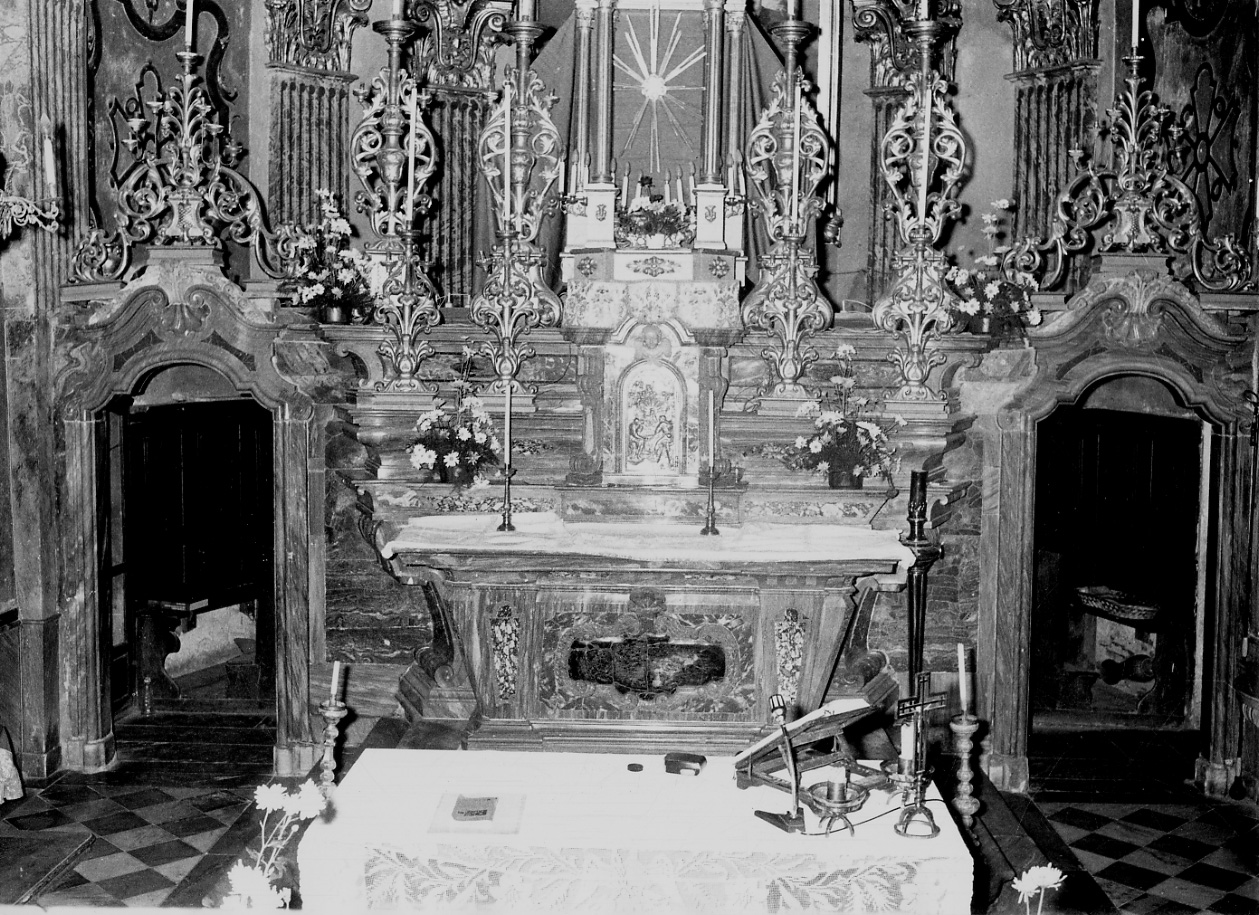 La parte centrale dell'ancona può essere suddivisa in tre fasce orizzontali di diversa grandezza e disegno. La fascia inferiore ha decorazioni a foglie e volute in marmo grigio di Valdieri, con intarsi in marmo rosso misto di Francia, giallo di Verona e broccatello di Spagna. Quella intermedia, sempre in grigio di Valdieri, ha intarsi in broccatello di Spagna, incorniciati in giallo di Verona, mentre quella superiore ha ai lati due fregi a volute