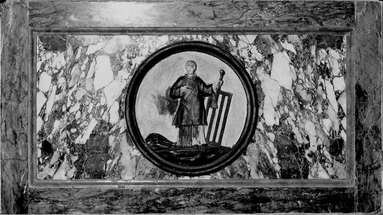 La mensa sporgente presenta frontalmente un riquadro decorato da un tondo in gesso, raffigurante S. Lorenzo e limitato da lesene profilate in marmo bianco, con palmetta e voluta terminale