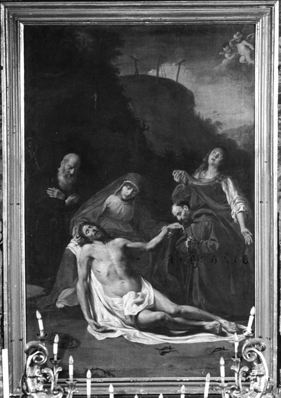 In primo piano vi è il Cristo sostenuto dalla Vergine che presenta un abito rosso e il manto azzurro. A destra vi è un francescano, San Francesco, (col saio marrone) e la Maddalena, a sinistra vi è un santo in abito nero, Sant'Antonio Abate. Sul fondo, una balza boscosa assai scura, il Golgota, un cielo azzurro con nubi e un paesaggio lontano con case. In alto a destra due angolini. In basso a terra vi sono i chiodi e la corona di spine. Sul terreno, a sinistra del Cristo, vi è la firma dell'artista e la data di esecuzione