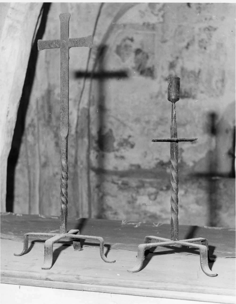 Il servizio d'altare è composto da una croce e da due candelieri. I candelieri e la croce sono sostenuti da liste di ferro battuto, formate da un'asta verticale torta nella metà inferiore e appiattita in quella superiore