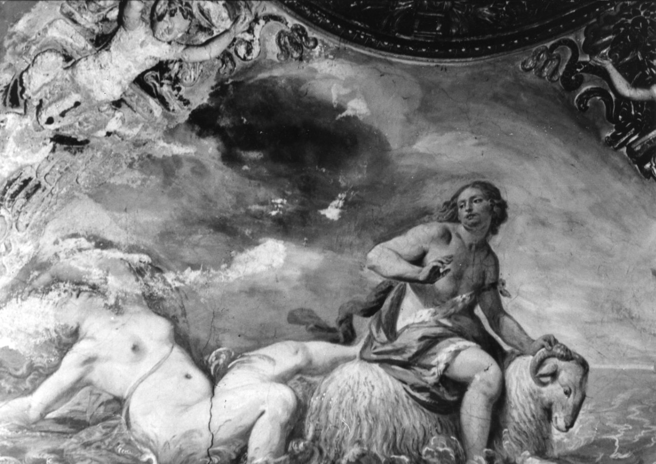 Contro un ampio cielo, in cui le nubi cupe contrastano con gli sprazzi di azzurro, si profila in primo piano la figura di Elle che cade in mare e Frisso, con drappi rosa e violetti, che si volge a guardarla, reggendosi saldamente all'ariete