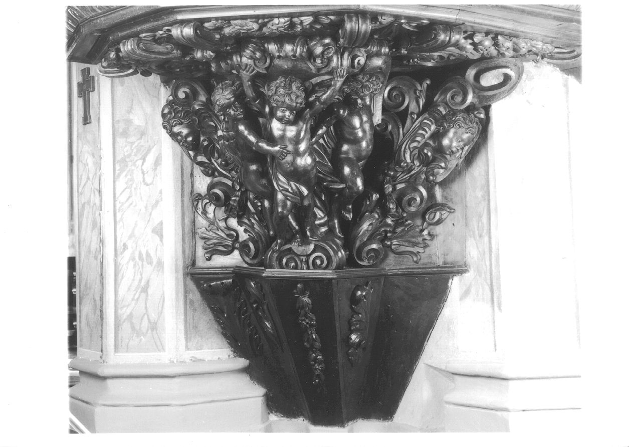 Basamento del pulpito formato da tre angioletti a tutto tondo che sorreggono la base della tribuna. Decorazione: ampie volute, ornati vegetali, e due testine cherubiche ai lati