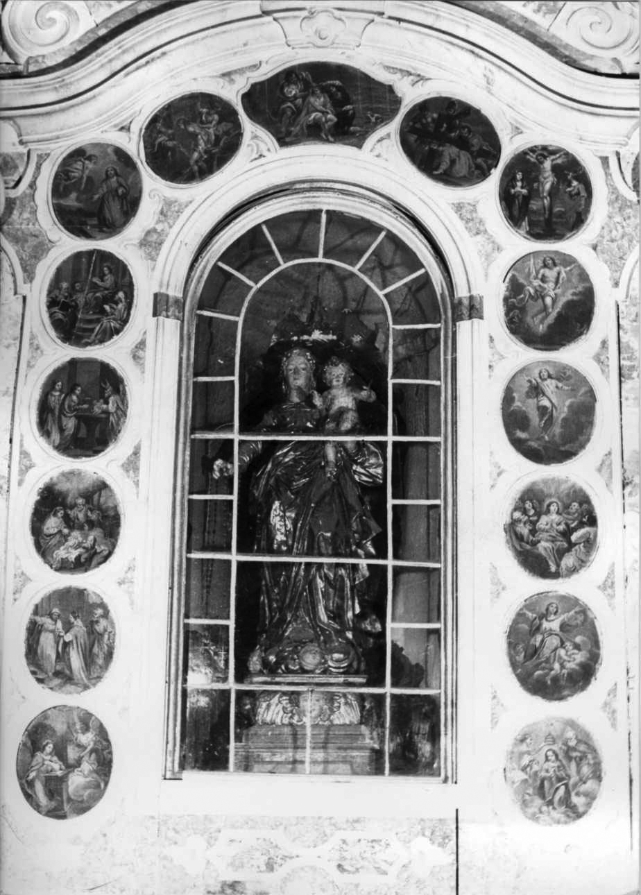 I 15 Misteri del Rosario (5 gaudiosi, 5 dolorosi e 5 gloriosi) raffigurano le scene tradizionali in dipinti disposti intorno alla nicchia dell'altare del Rosario (tutti ovali tranne quello centrale superiore di forma mistilinea) e inseriti entro cornici marmoree dell'alzata