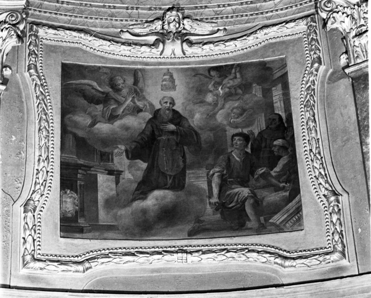 Cornice mistilinea sormontata da un cherubino. La cornice è formata da foglie di alloro e palmette trattenute in basso al centro da nastri e agli spigoli da foglie d'acanto. Dentro le cornici sono dipinti alcuni momenti della vita di San Francesco da Paola