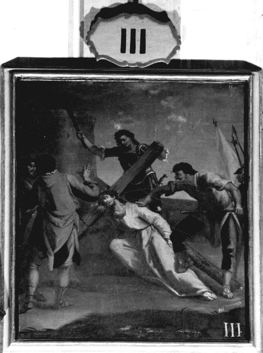 Al centro, in primo piano, è rappresentato il Cristo con la veste rossa e il capo cinto dalla corona di spine, che cade a terra, sotto il peso della croce. Uno sgherro, sulla destra, munito di bastone, barbato, che indossa camicia, calzoni al polpaccio e sandali e un soldato, dietro la croce, con capelli lunghi e mossi, lorica e spada sul fianco, munito di frusta,lo minacciano affinché si alzi. Sulla sinistra, due figure maschili, l'una di spalle con mantello, calzari e calzoni al ginocchio e l'altra, con abbigliamento analogo, barbata e di profilo, osservano la scena e fungono da quinta al dipinto. Sullo sfondo, a sinistra, un tratto di alte mura della città; sulla destra, si intravedono due soldati con elmo che brandiscono stendardi. Ampio brano di cielo livido, solcato da nubi, sulla destra. La tela è posta entro cornice di luce e formato rettangolare in legno dorato, in corrispondenza dei profili interno ed esterno e dipinto in verde chiaro. Tipologia a cassetta. Battuta liscia; fascia liscia. Nella parte superiore, al centro, cartella mistilinea profilata in oro; al centro indicazione in numeri romani
