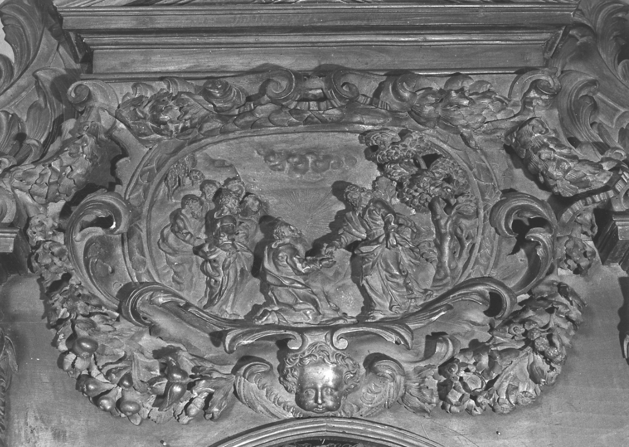Nel rilievo al centro è raffigurato Cristo che consegna le chiavi a San Pietro