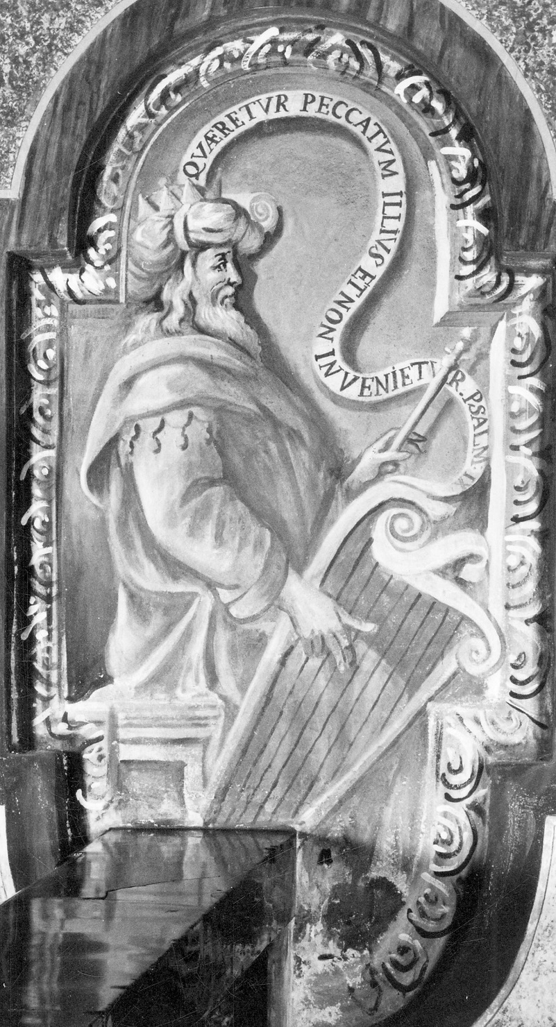 Il profeta David è seduto di profilo su di un alto masso squadrato, intento a suonare un'arpa da cui si stacca un lungo cartiglio curviforme. Sul capo porta un turbante incoronato e il volto di profilo è incorniciato da una lunga barba bianca. Indossa un mantello di color viola con un bordo chiaro, che scende su di una veste lunga fino ai piedi