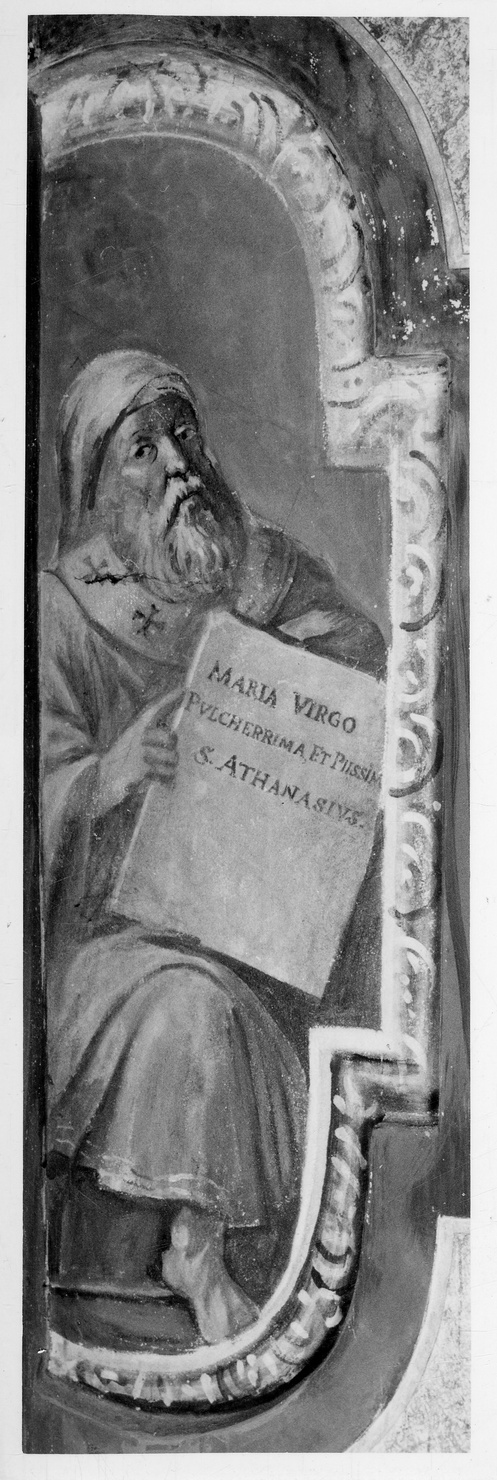 - ISCRIZIONI Sul libro - MARIA VIRGO/ PULCHERRIMA ET PIISSIMA/ S.ATHANASIUS - lettere capitali - a pennello - latino