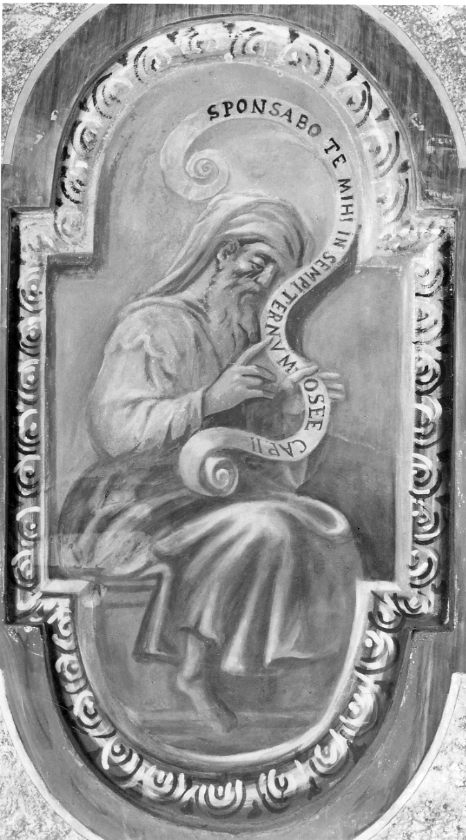Il Profeta è dipinto seduto su di un alto cubo in pietra, di profilo verso destra e regge un cartiglio bianco svolazzante. La veste è di color marrone che poco contrasta con il fondo seppia. I colori del restauro recente cancellano la pittura originale, soprattutto nel volto e nel bordo a imitazione del marmo, dalle tinte forti e violente
