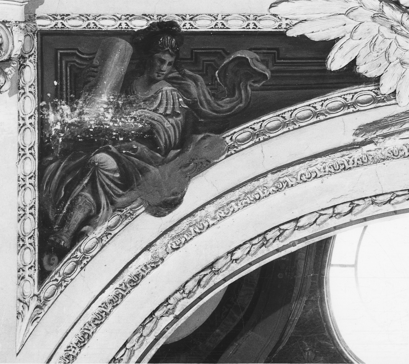 - NOTIZIE STORICO CRITICHE Anche questo affresco è alquanto rovinato per le cadute di colore; in particolare è andata quasi perduta la pittura debordante sulla cornice in stucco ad ovuli, di gusto caratteristicamente barocco. L'attribuzione a un pittore attivo alla fine del'600 è confortata dai numerosi esempi decorativi di palazzi torinesi dell'epoca e dalla più che probabile collaborazione con Pietro Sommasso, autore degli stucchi negli ultimi anni del XVII secolo