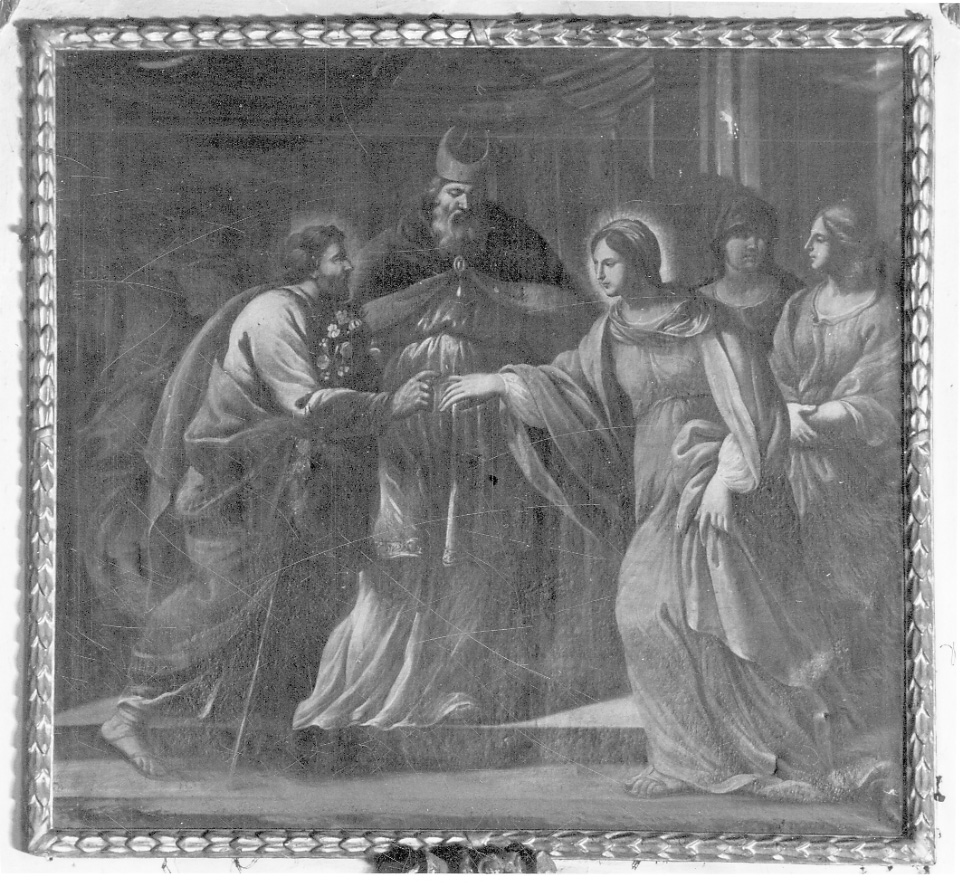 Il dipinto raffigura lo sposalizio della Vergine. All'interno di un tempio che fa da sfondo all'avvenimento, la Madonna, con la veste rossa coperta dal mantello blu opaco, porge la mano a San Giuseppe. Il santo, con una tunica marrone sulla veste bianca, regge con una mano la verga fiorita e offre l'anello sotto lo sguardo del sacerdote che unisce i due personaggi; a lato due figure femminili illuminate da una luce poco luminosa, fanno da quinta all'avvenimento. Attorno c'è una cornice dorata, a foglie di alloro